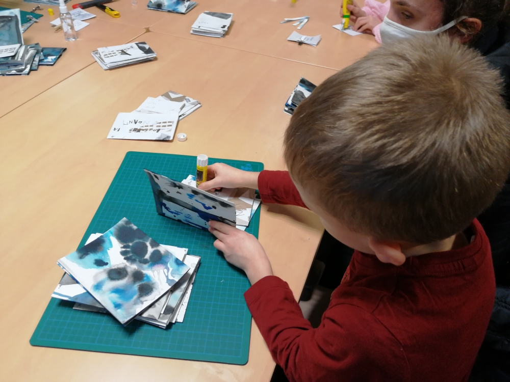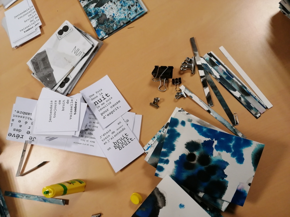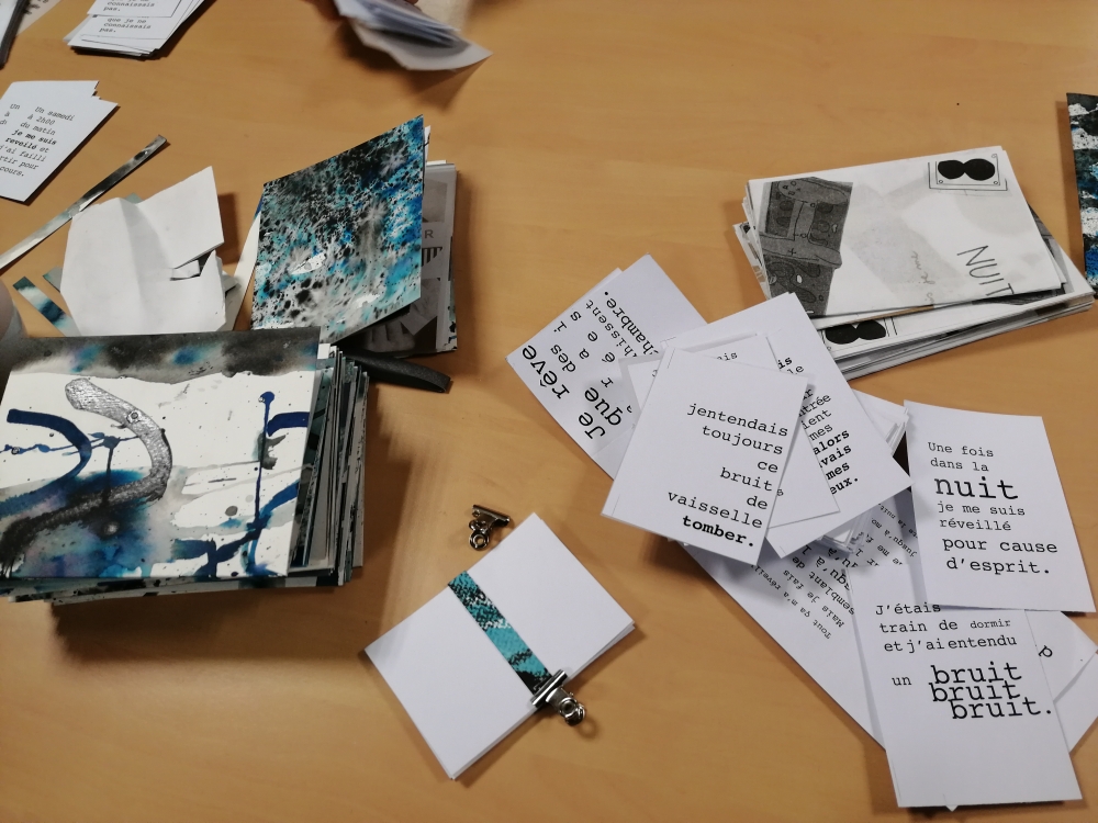 Un groupe d'adolescents du LALP et un groupe d'enfants du Centre Social de la Briquette ont ainsi pu découvrir tout au long de ces séances des techniques de reliure, pliage, pop-up, gravure, écriture, collage et aussi, pas à pas, ils ont appris comment se construit un livre d’artiste, autour du thème de la nuit. L’occasion pour chacune et chacun, à travers différents exercices, d’évoquer des souvenirs de leurs rêves et des bruits entendus la nuit.