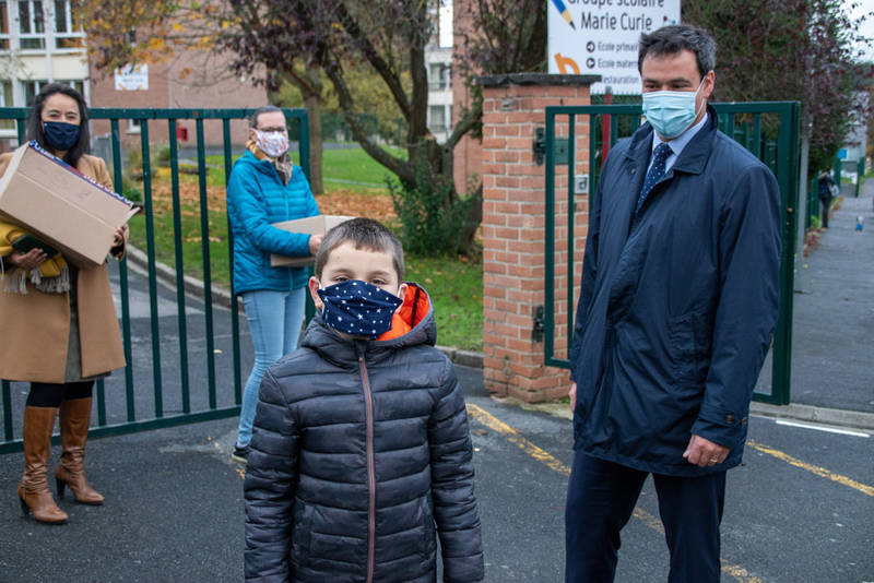 Le 2 novembre dernier, après les vacances de la Toussaint, la Municipalité s’est rendue aux abords des différentes écoles de la Ville afin de s’assurer du bon déroulement de la rentrée scolaire. Monsieur le Maire, Jean-Noël VERFAILLIE, accompagné de l’adjointe chargée de la politique éducative, Assia COSTANZO en ont profité pour offrir aux enfants, avant l’entrée en classe, des masques.