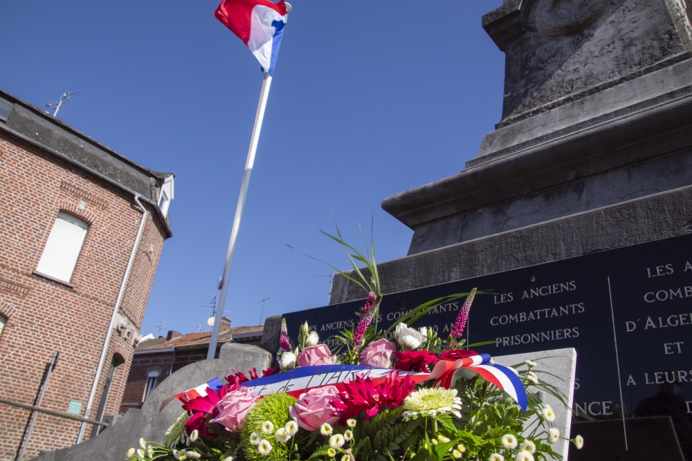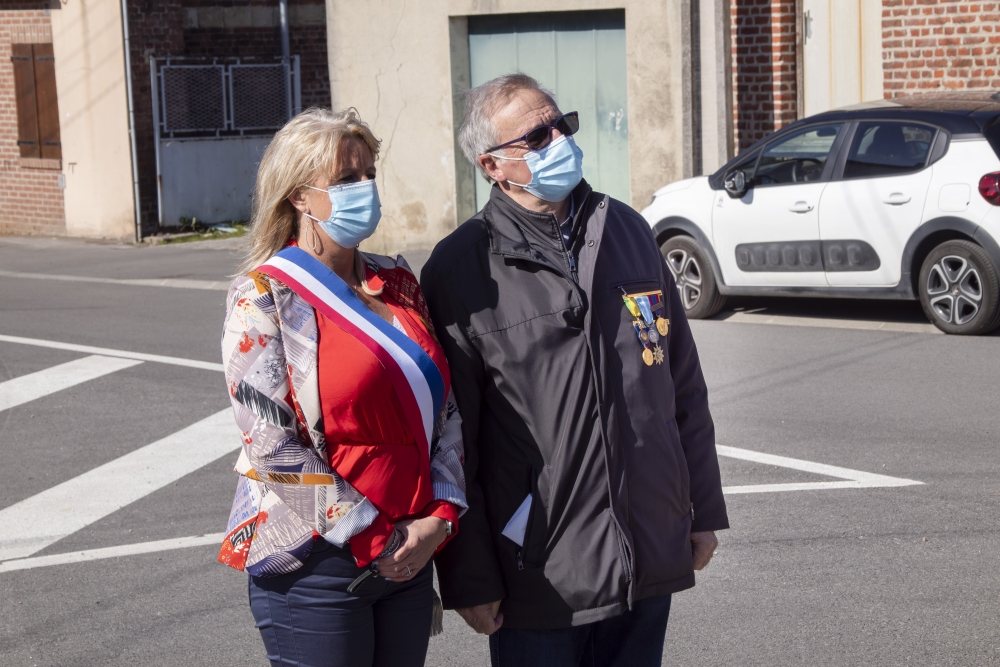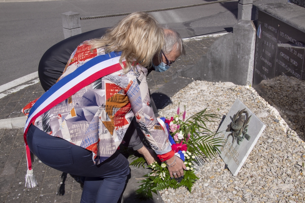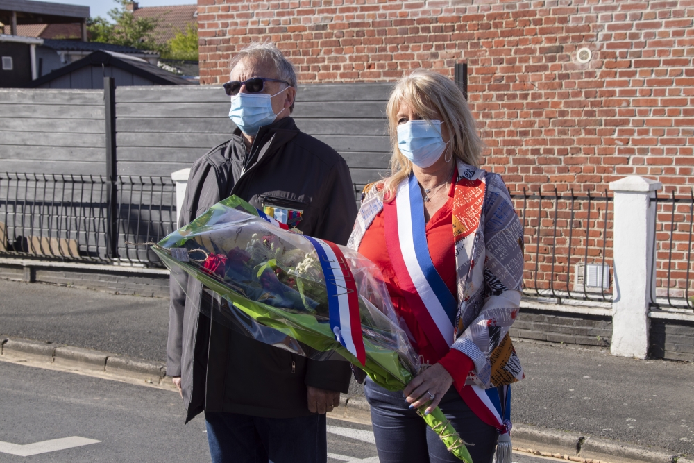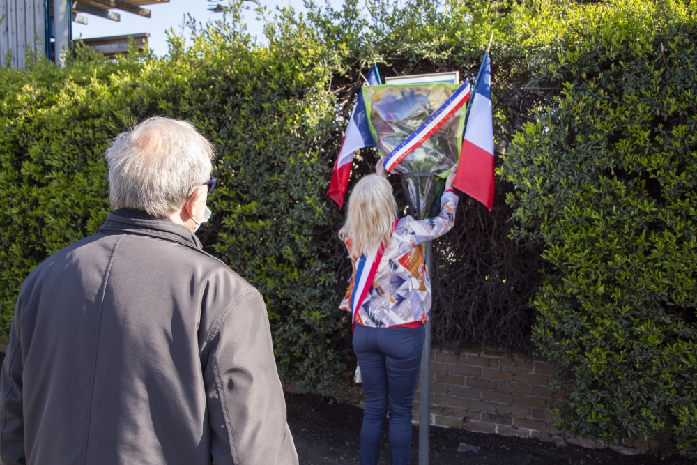 Devant les plaques Fondu, Delbove et Gontier, Isabelle Lachaussée et Joël Boute, respectivement adjointe en charge de la vie patriotique et conseiller délégué au protocole et aux affaires militaires et patriotiques ont déposé des gerbes de fleurs.