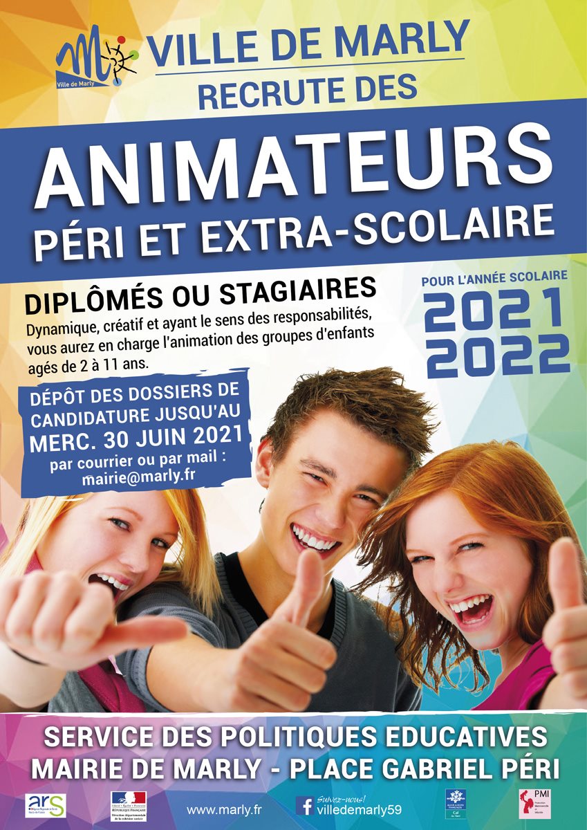 La Ville de Marly recrute des animateurs pour les temps périscolaires de l’année scolaire 2021-2022 : le matin, le midi, le soir, les mercredis.