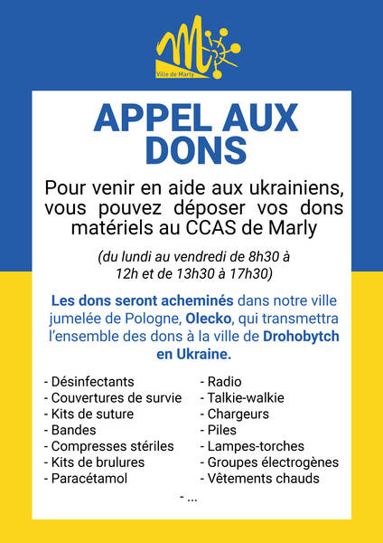 Ces dons peuvent être déposés au CCAS de la ville de Marly, Place Gabriel PERI.