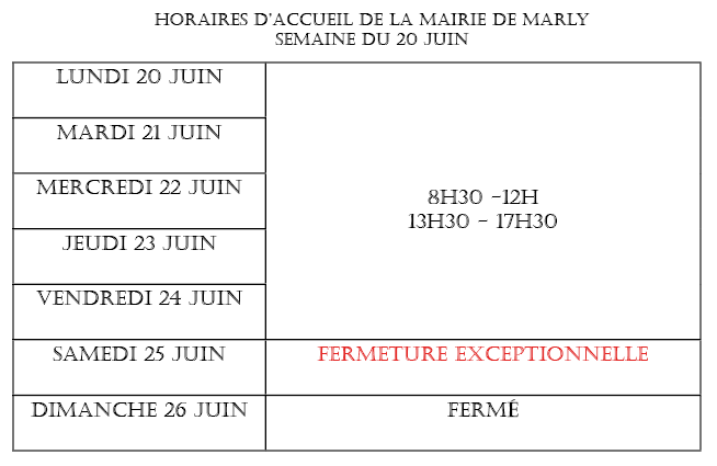 L’accueil de la Mairie de Marly sera exceptionnellement fermé ce samedi 25 juin.