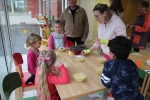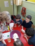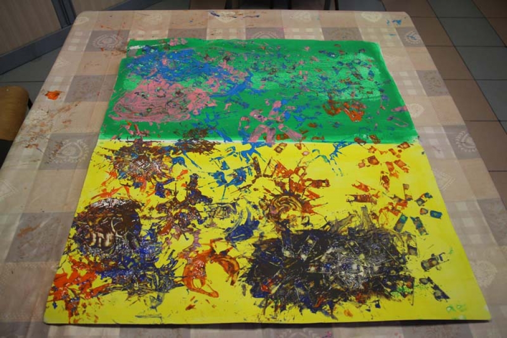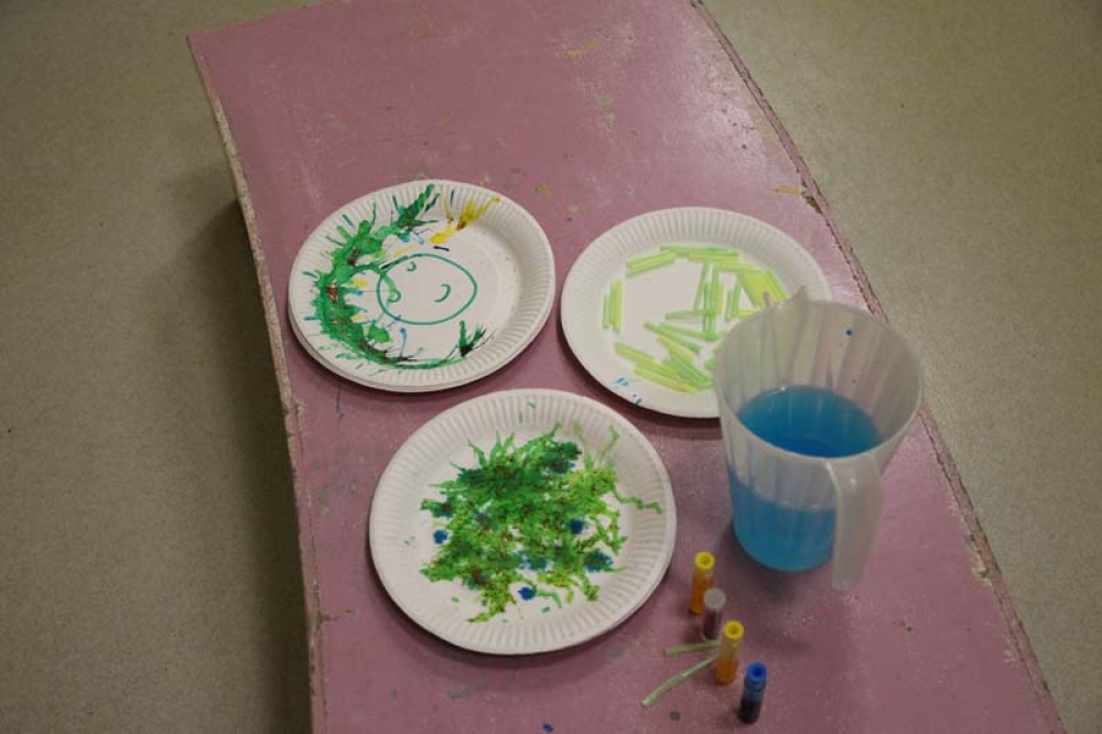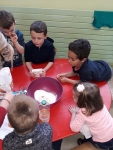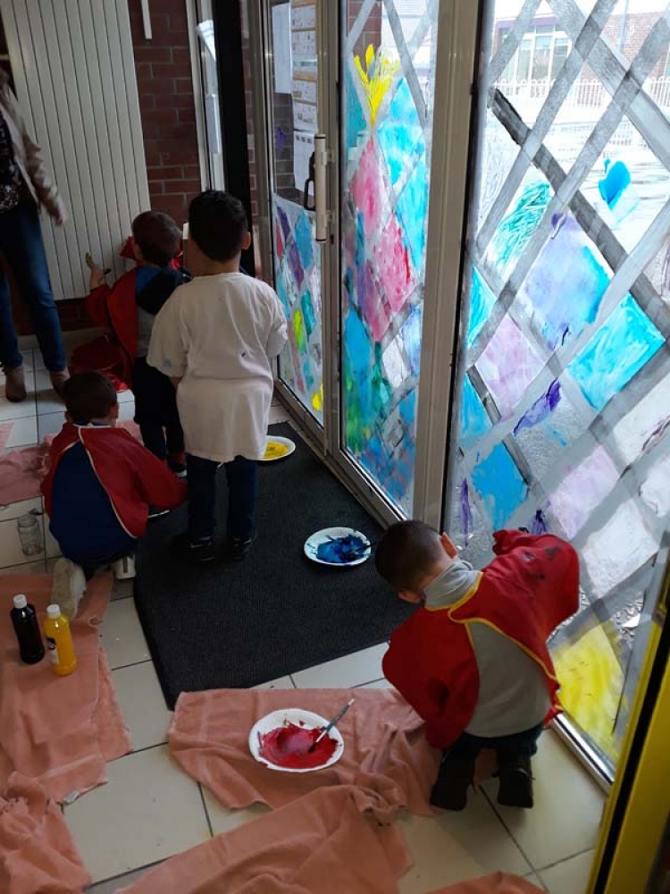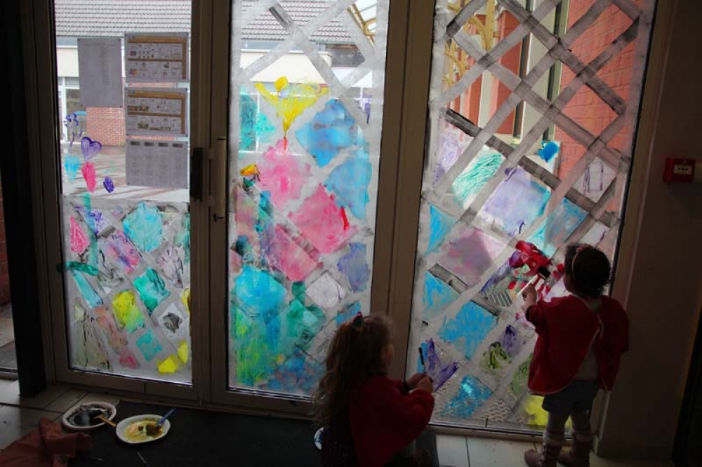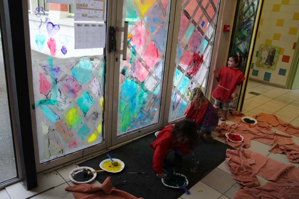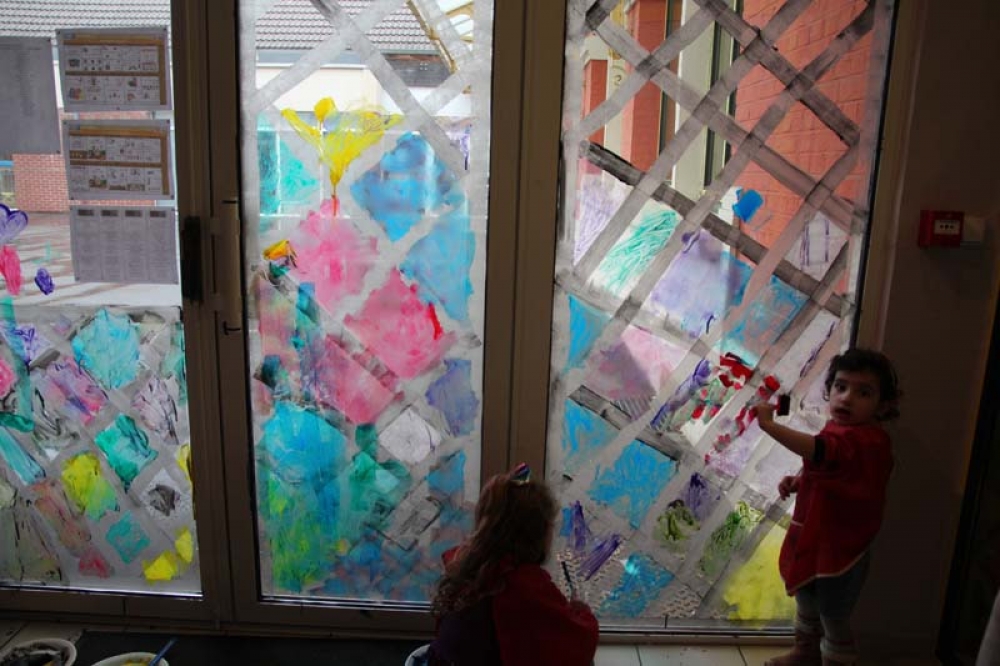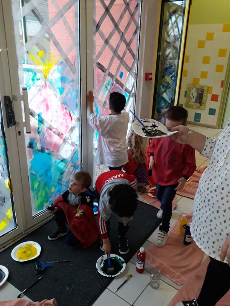 Dans la crème dessert, on ajoute des colorants pour manger et s'amuser ! A l'atelier peinture, on reproduit des feux d'artifice et des bonshommes aux drôles de cheveux, en soufflant dans des pailles, ce qui fait de chaque dessin, un dessin unique ! Les petits ont même eu le droit de peindre sur les portes de la cantine, créant ainsi un magnifique vitrail, parfaitement mis en valeur dès que le soleil aura fini de se cacher !