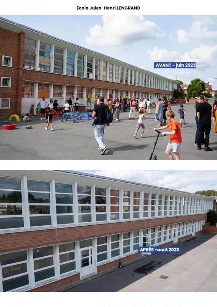 L'école a été entièrement repeinte, des nouveaux revêtements de sols et des éclairages leds moins énergivores ont été posés et du nouveau mobilier a remplacé les anciens éléments devenus vétustes. Des travaux de fondations ont été effectués cet été pour accueillir le nouveau préau qui augmente la taille de celui déjà en place. Les 152 menuiseries et fenêtres, du rez-de-chausée et du premier étage ont été intégralement remplacées et des nouveaux sanitaires adaptés aux tout petits ont été installés pour l’école maternelle. Coût de l’opération : 600 000€