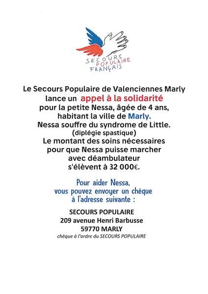 En concertation avec la famille et la Municipalité, emmenée par M. le Maire, Fabien THIEME, le comité de Valenciennes Marly du Secours Populaire Français a lancé un appel à la solidarité, afin de permettre à la petite Marlysienne de bénéficier de ces soins.
