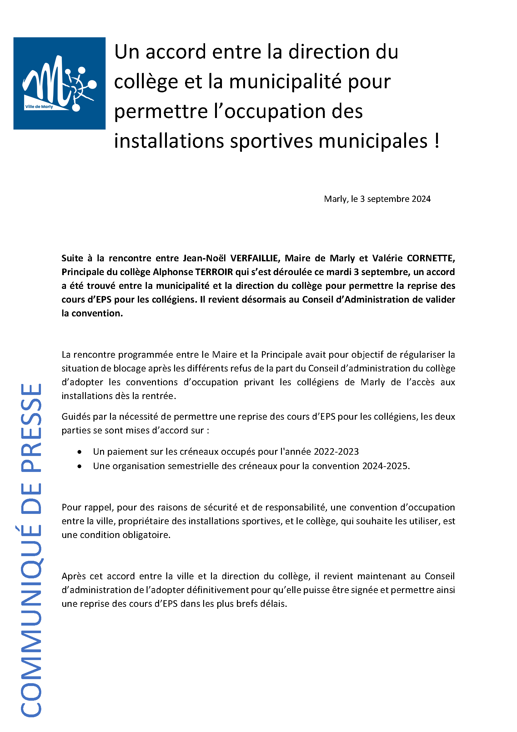Suite à la rencontre entre Jean-Noël VERFAILLIE, Maire de Marly et Valérie CORNETTE, Principale du collège Alphonse TERROIR qui s’est déroulée ce mardi 3 septembre, un accord a été trouvé entre la municipalité et la direction du collège pour permettre la reprise des cours d’EPS pour les collégiens. Il revient désormais au Conseil d’Administration de valider la convention.