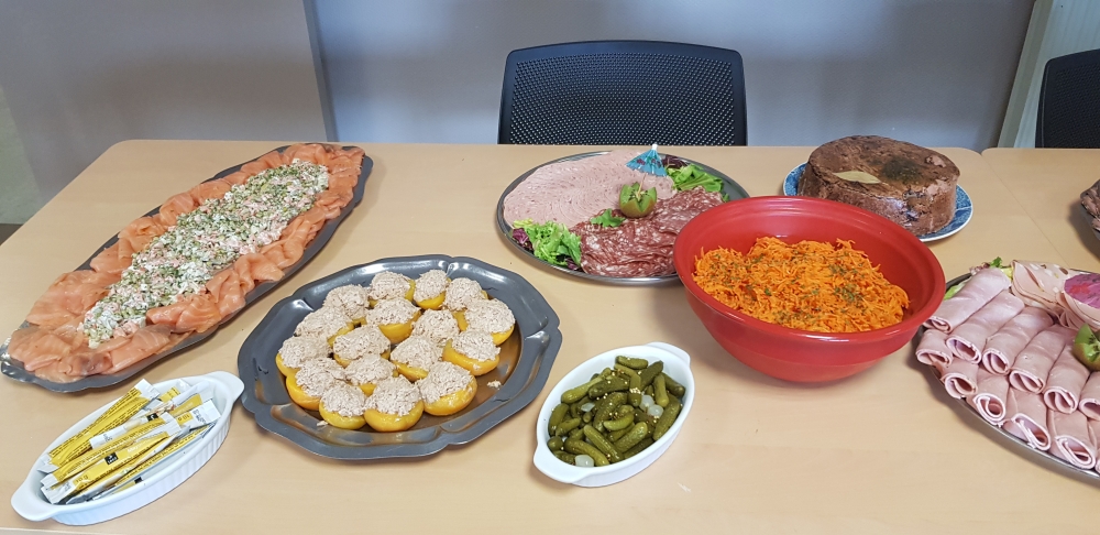 Sous forme de buffet, les convives ont apprécié la qualité du repas : charcuteries et terrine en entrée, rôti de bœuf et pilons de poulet accompagnés de salades puis en dessert une bonne glace.