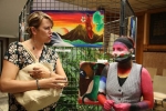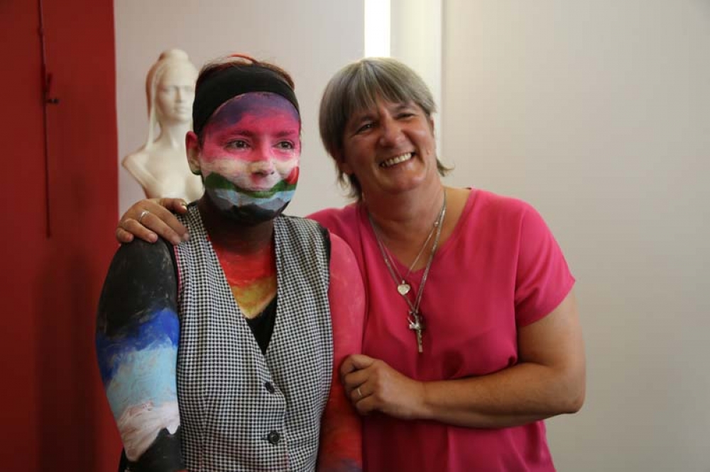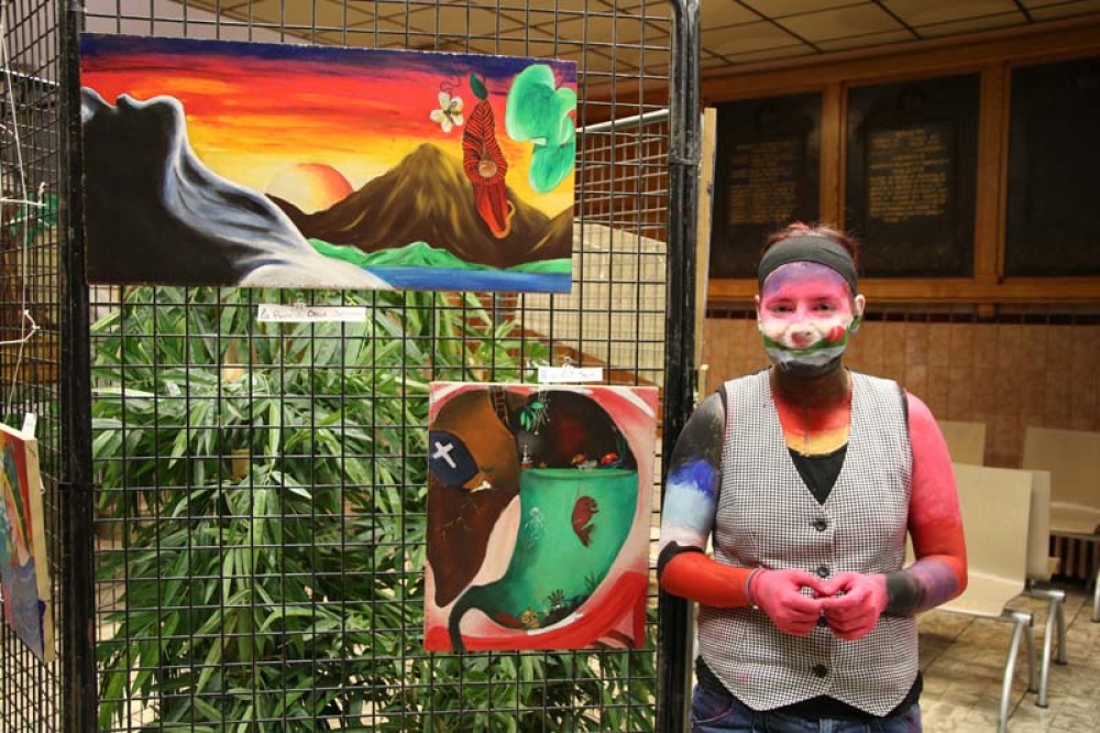 En plus d'exposer ses réalisations, l'artiste s'était elle-même transformée en oeuvre d'art avec un maquillage complet du corps, telles des peintures de guerre lui permettant d'affronter le public.