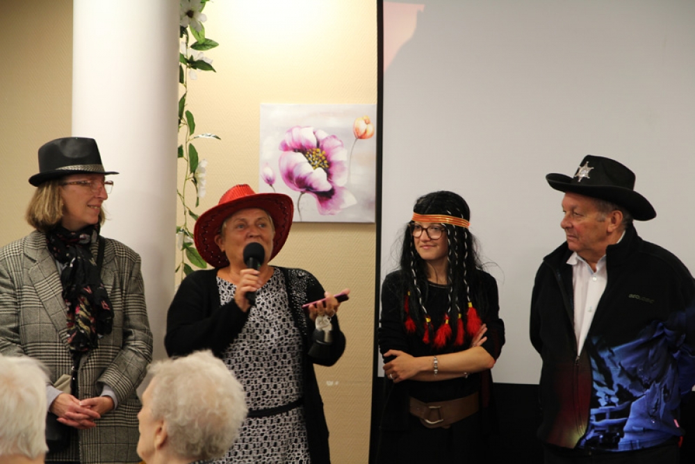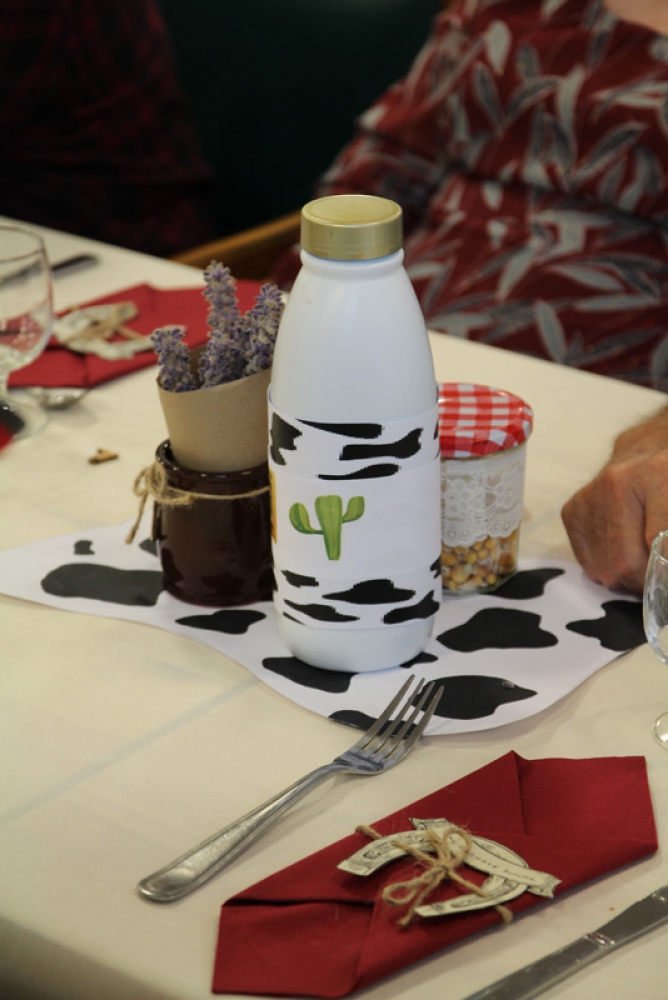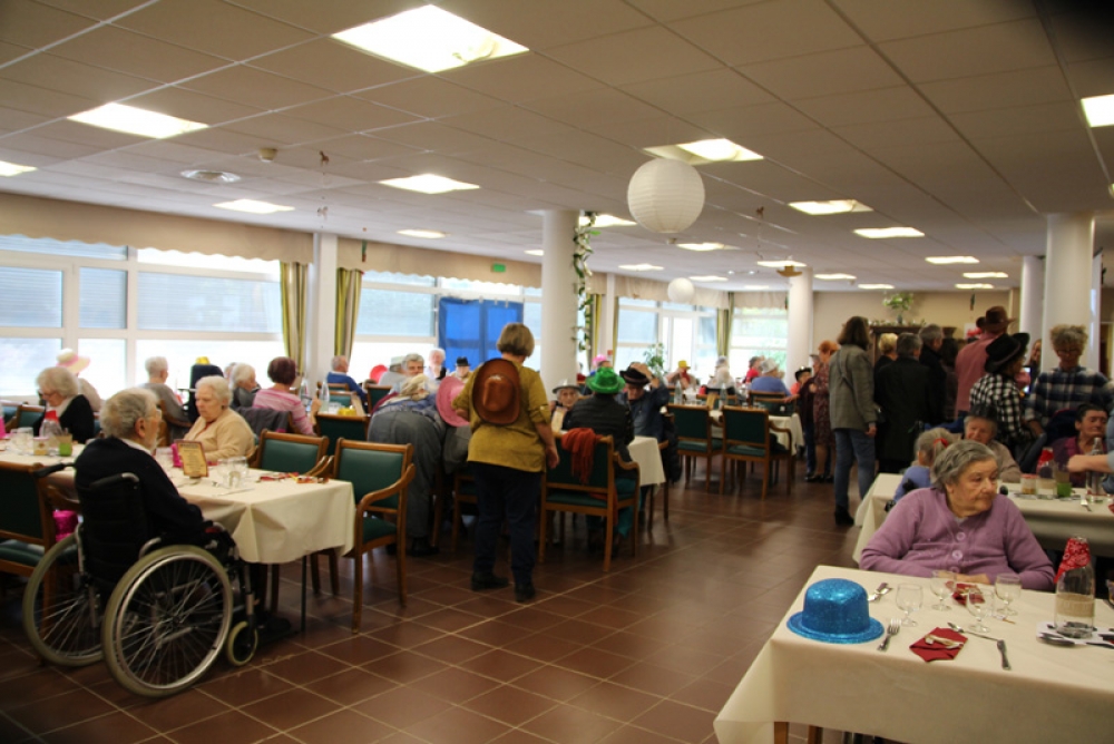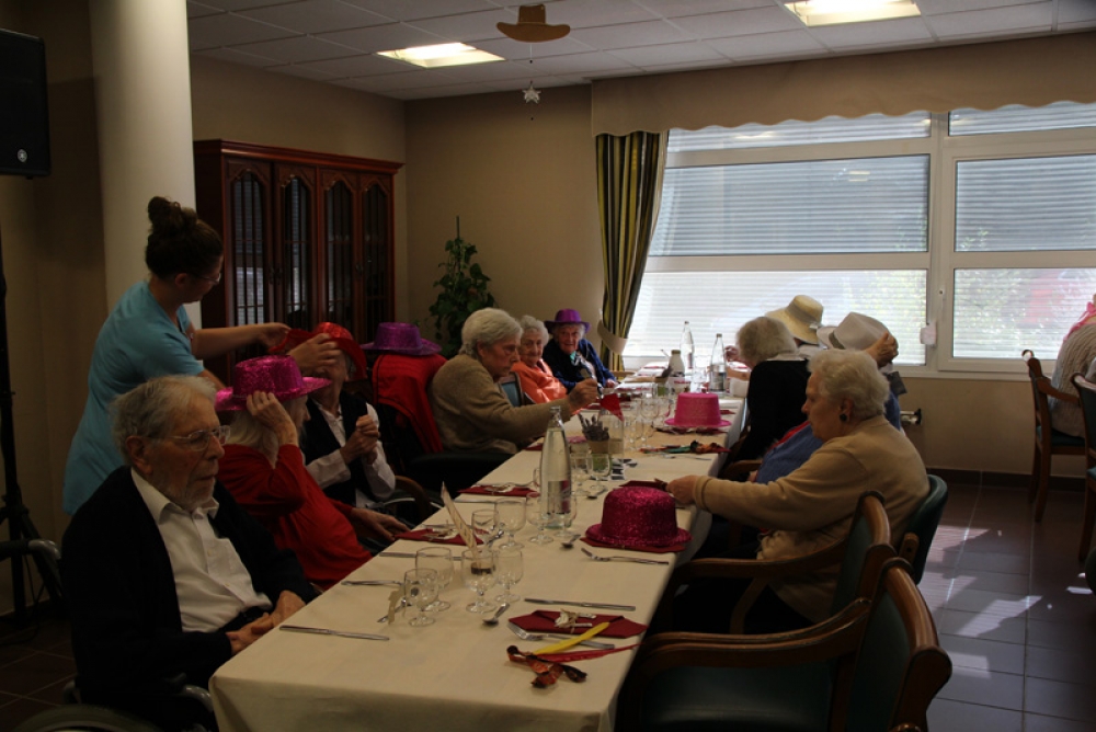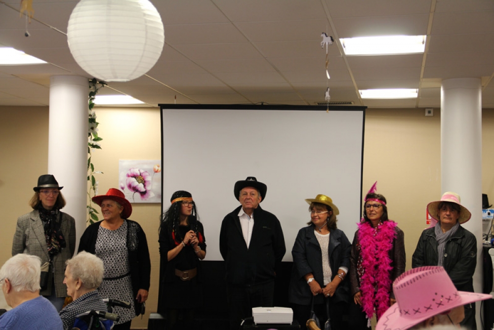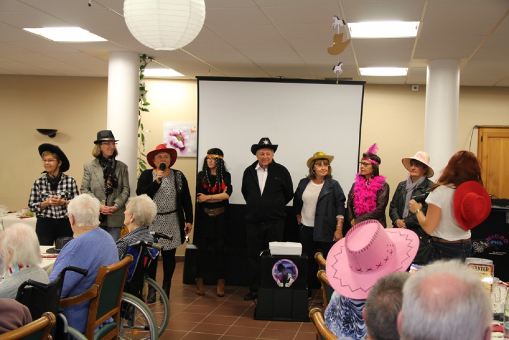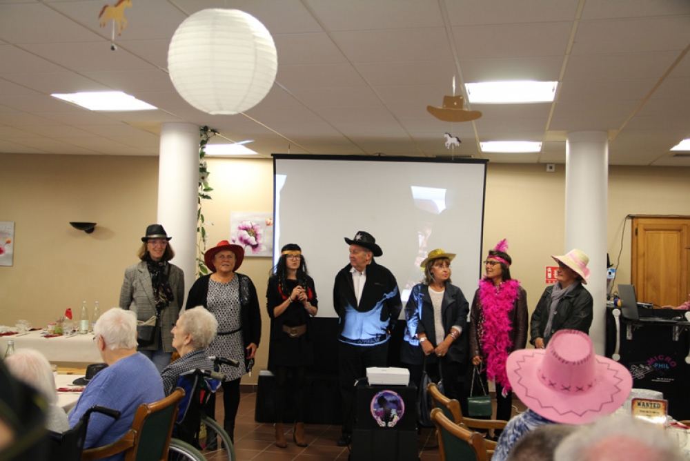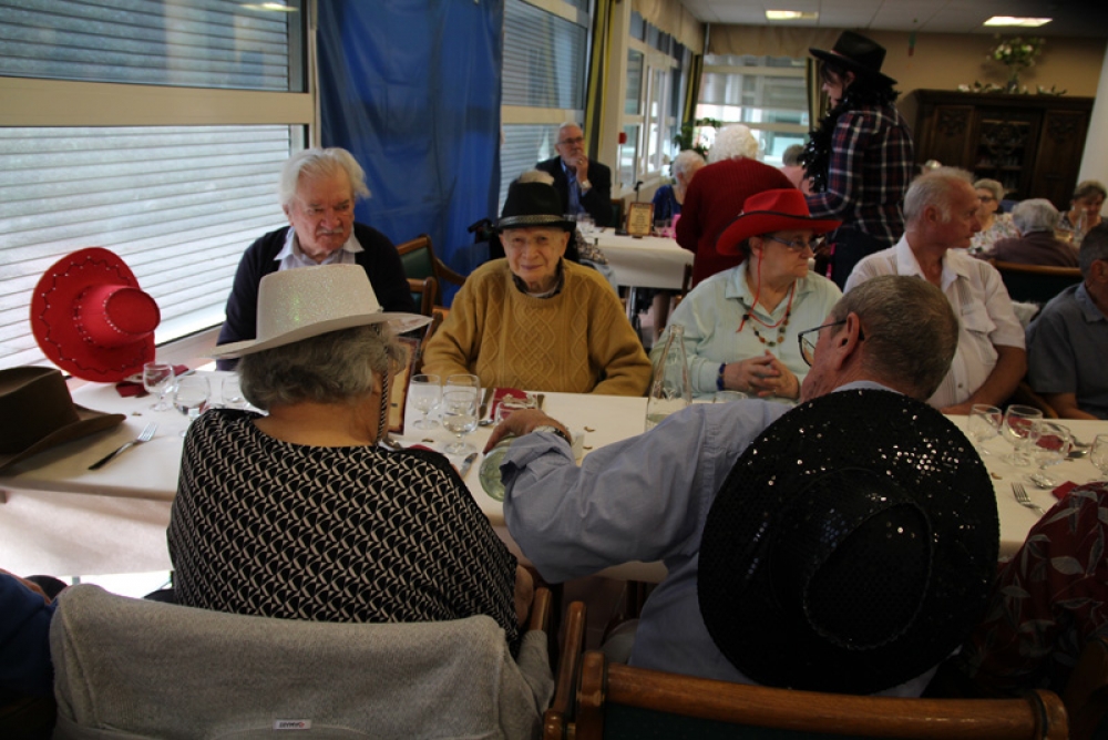 Les membres du personnel, en charge de l’animation et accompagnant au plus près les personnes âgées, eux aussi déguisés, ont trinqué avec les convives pour les amener dans cette bonne ambiance de saloon. Une jolie déco de table, un bon repas en perspective, des chanteurs de variété Française, style country, projetés sur grand écran, tout était organisé pour créer une ambiance festive et chaleureuse !