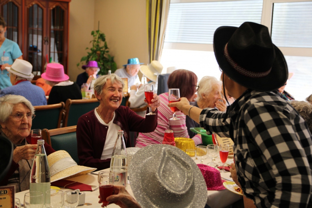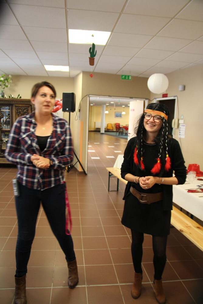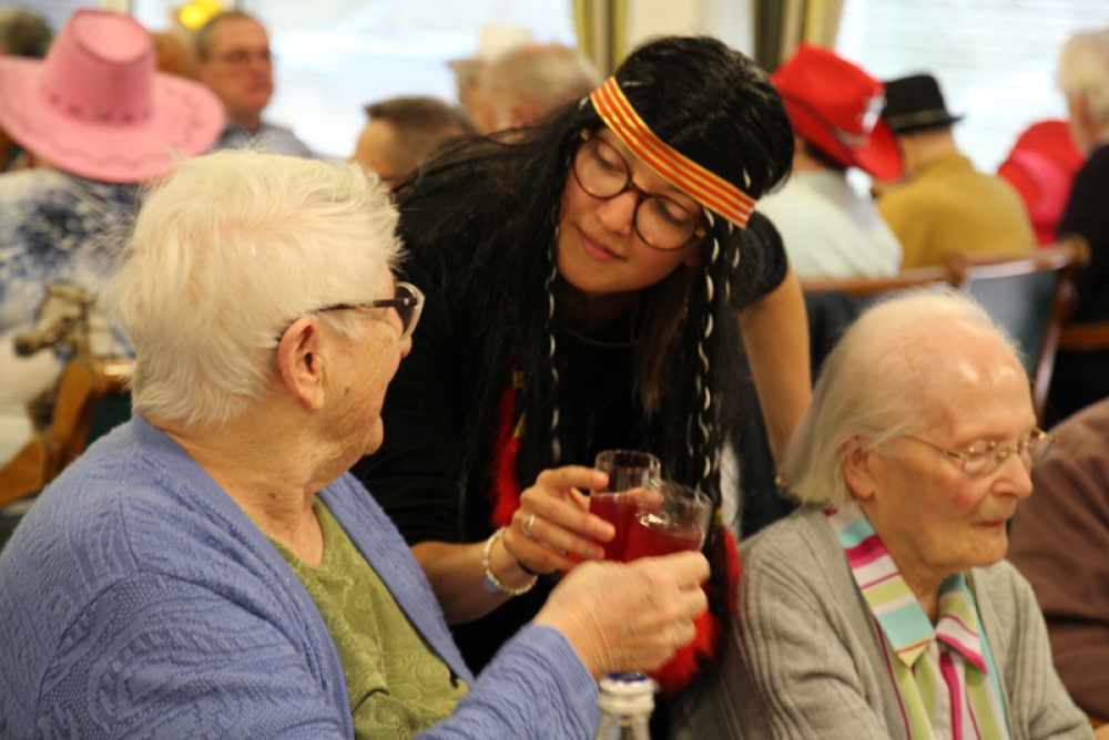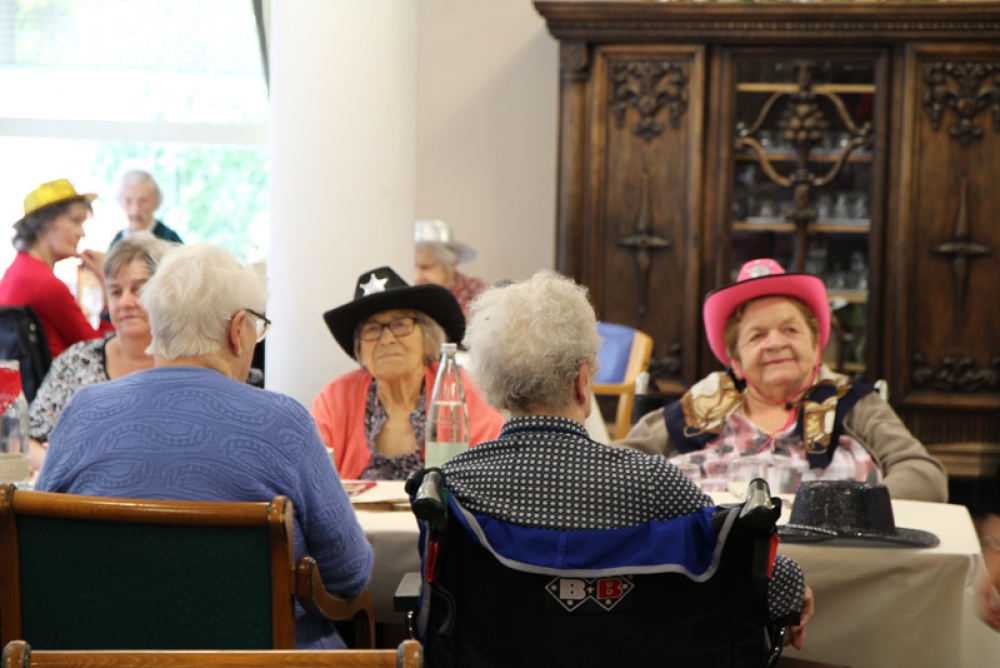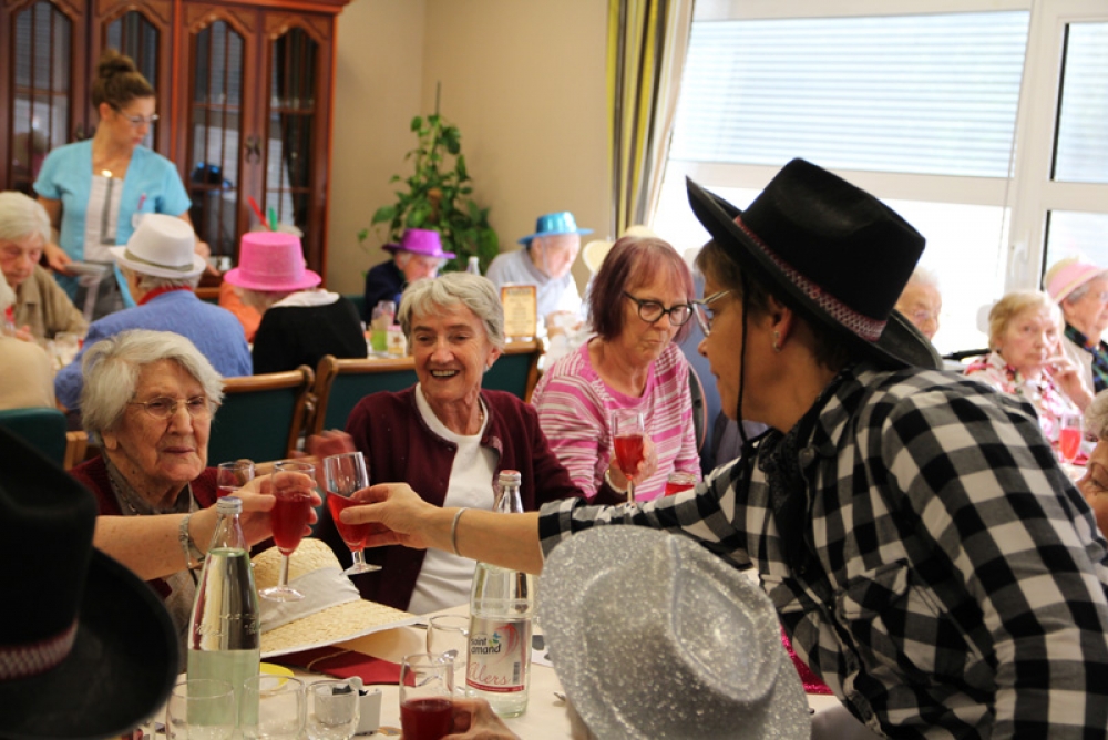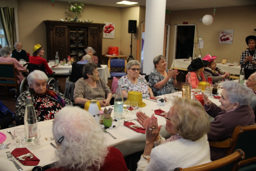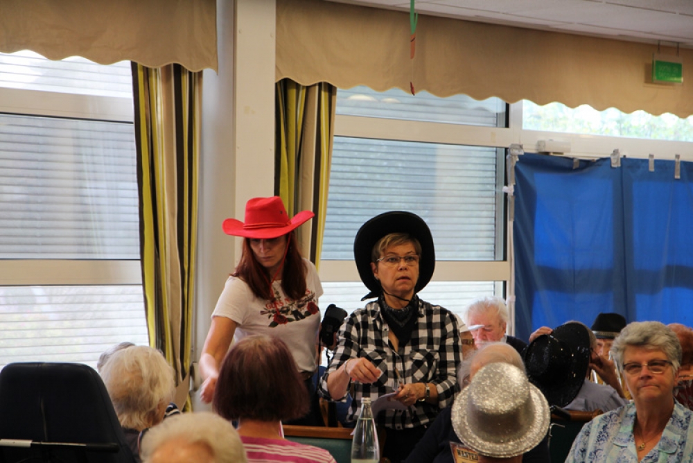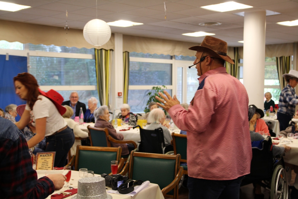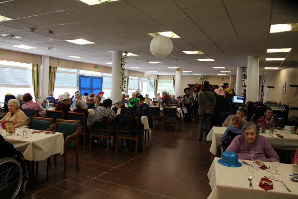 Les membres du personnel, en charge de l’animation et accompagnant au plus près les personnes âgées, eux aussi déguisés, ont trinqué avec les convives pour les amener dans cette bonne ambiance de saloon. Une jolie déco de table, un bon repas en perspective, des chanteurs de variété Française, style country, projetés sur grand écran, tout était organisé pour créer une ambiance festive et chaleureuse !