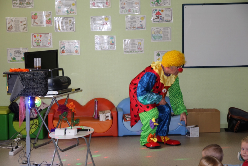 Vêtu de son costume coloré, de son fameux nez rouge et de chaussures trop grandes, notre clown a réalisé des tours de passe-passe devant les bambins aux yeux écarquillés et sourires aux lèvres ! Quelques-uns ont même participé à faire des tours de magie devant tous les copains !