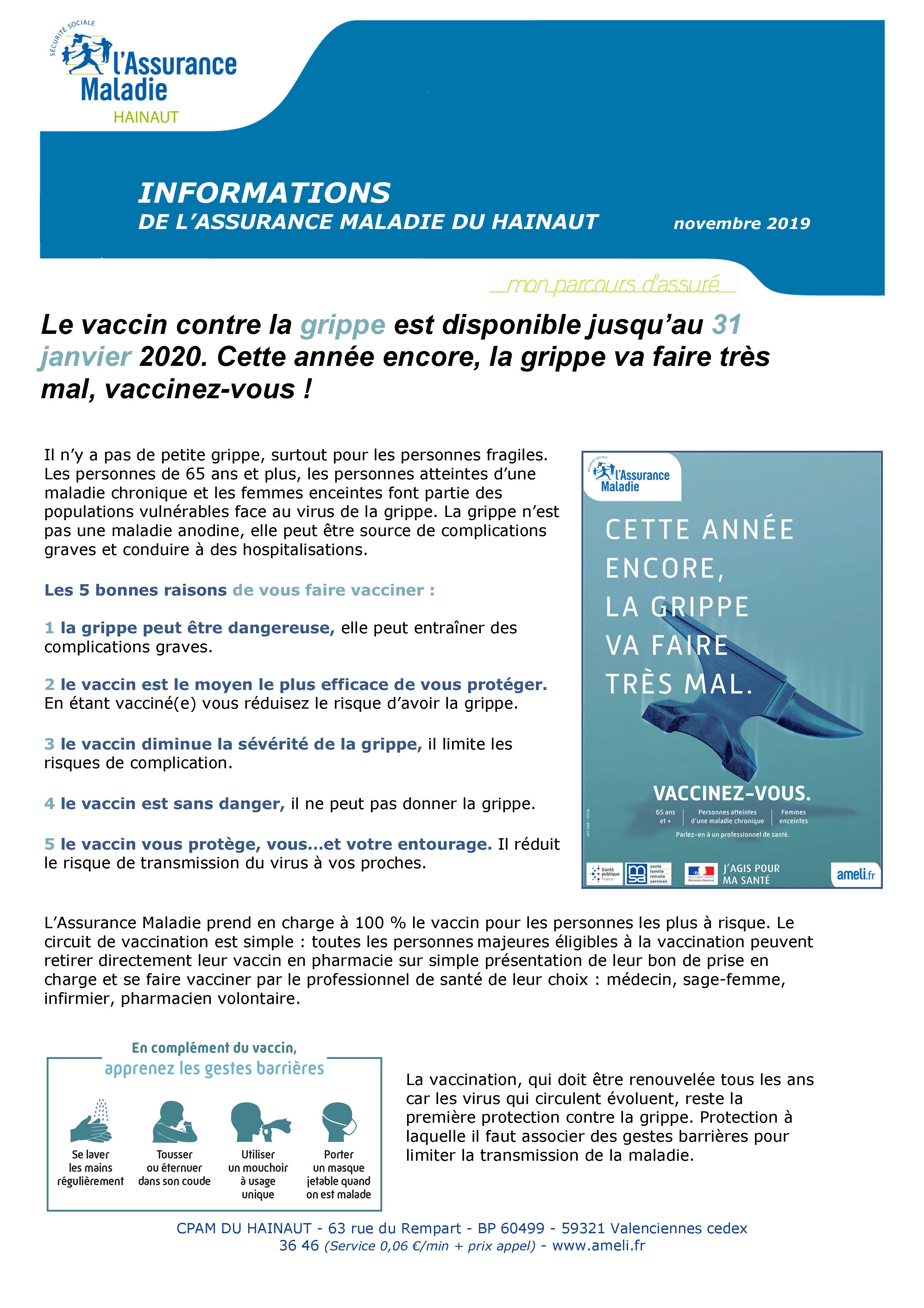 Le vaccin contre la grippe est disponible jusqu’au 31 janvier 2020. Cette année encore, la grippe va faire très mal, vaccinez-vous !