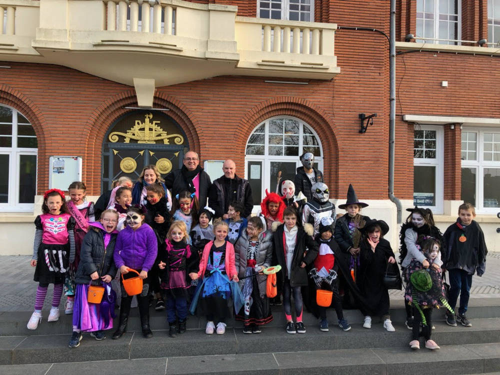 Les tout-petits s'en sont donné à coeur joie pour arborer capes, chapeaux et maquillages lugubres ! Après avoir collecté des bonbons dans la ville, ils ont fini par une visite en Mairie. Les sorcières, vampires et chauve-souris se sont emparés des locaux de l'Hôtel de Ville en investissant tous les services. Monsieur le Maire, après beaucoup de frayeur et après avoir évité tous les sorts, les a accompagné sur le parvi pour une photo souvenir qui restera dans les memoires de tous les jeunes apprentis fantômes !
