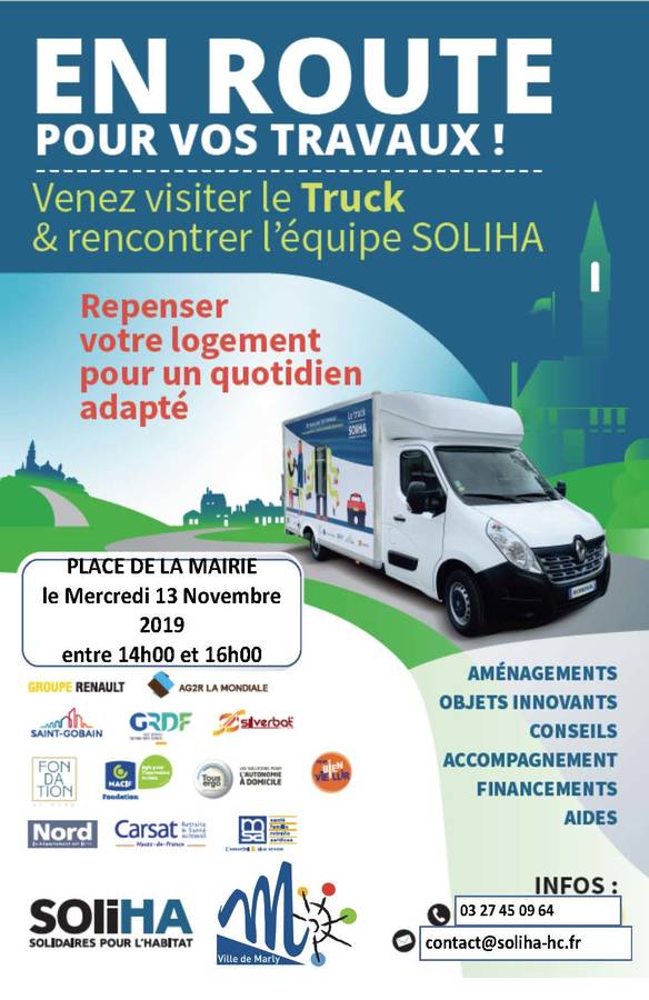 L’Association SOLIHA, en partenariat avec la Ville de Marly, organise sur la place Gabriel Péri devant la salle des fêtes une opération "TRUCK" le mercredi 13 novembre de 14h à 16h lors du Goûter des Aînés. Ce "drôle" de camion propose des idées et des aménagements pour les logements des personnes âgées et ou en situation de handicap.