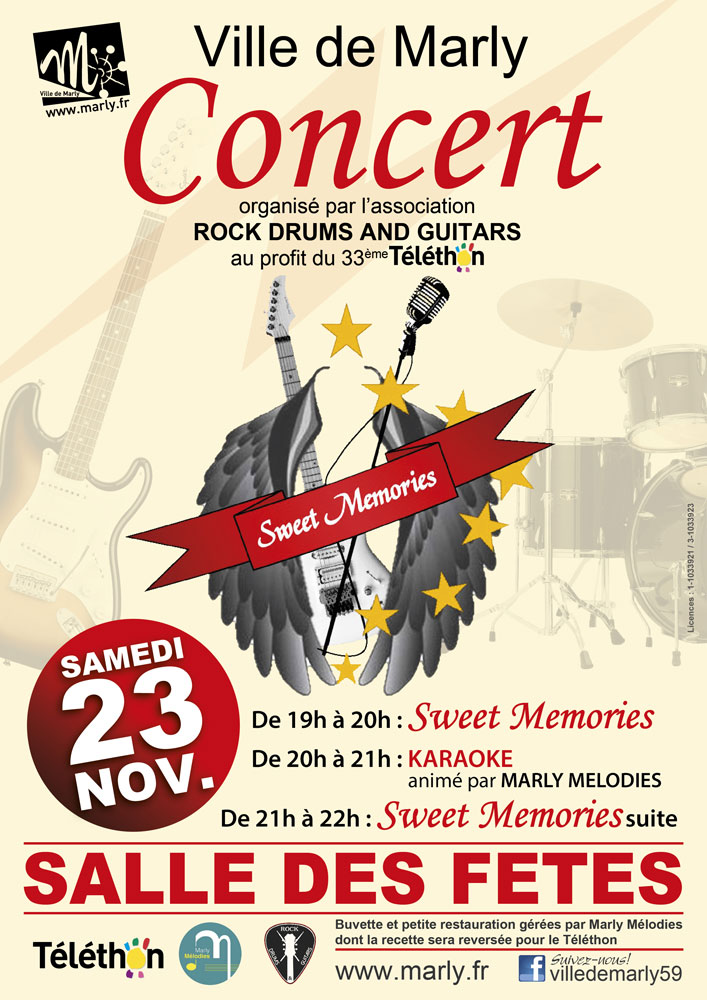 Venez également applaudir les musiciens du groupe "Sweet Memories", concert organisé par l'Association "Rock Drums and Guitars", avec la participation de la chorale "Marly Mélodies" pour un karaoké, le samedi 23 novembre dès 19h à la salle des Fêtes.