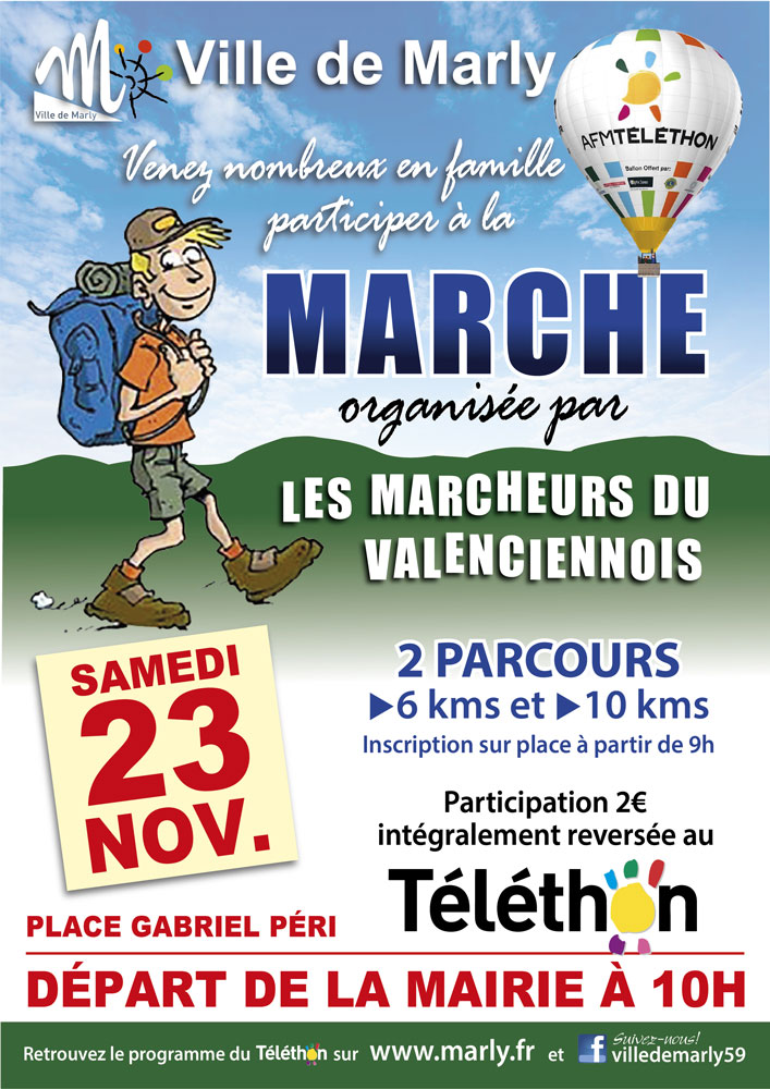 Notament le samedi 23 novembre avec la Marche (6 ou 10 Kms) organisée par l'Association "Les Marcheurs du Valenciennois", au départ de la mairie à 10h (inscription à 9h sur place, participation de 2€ intégralement reversés au Téléthon.