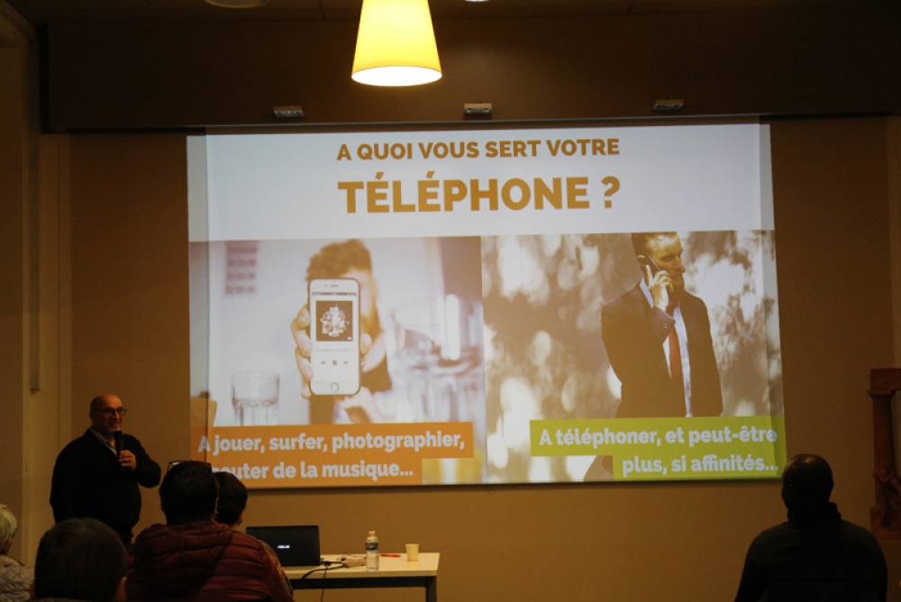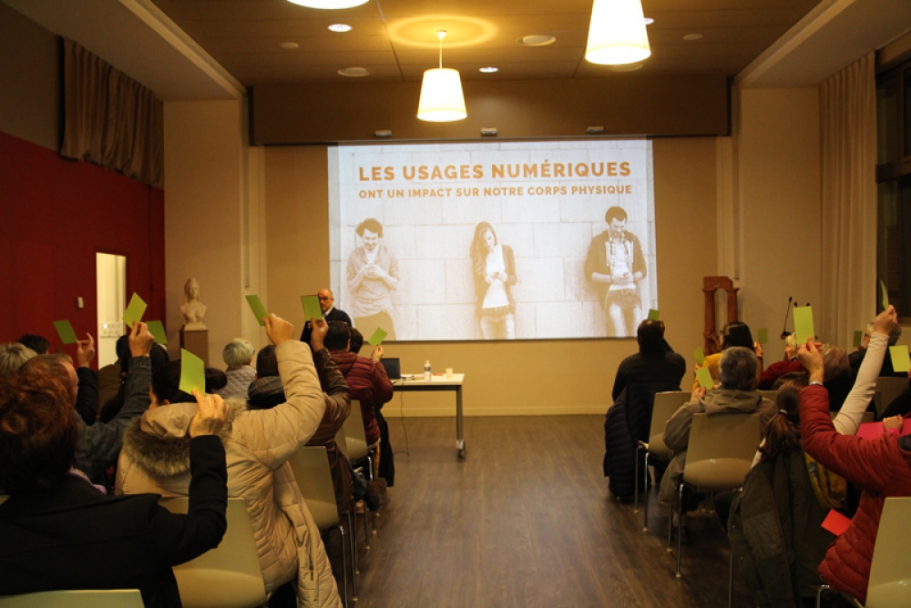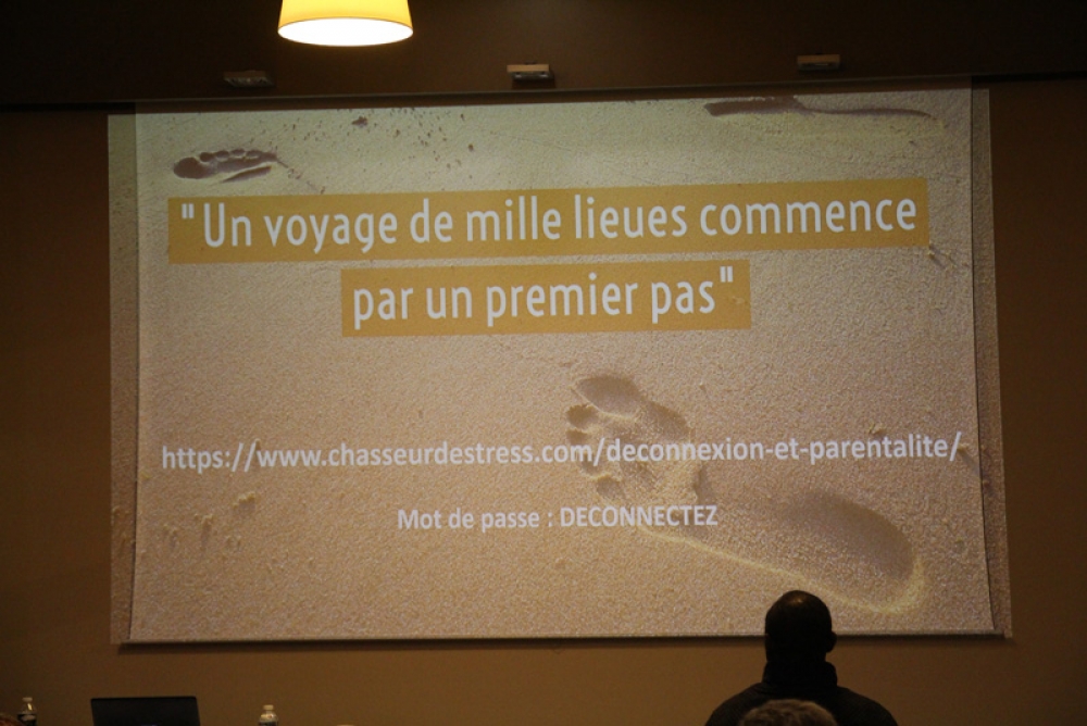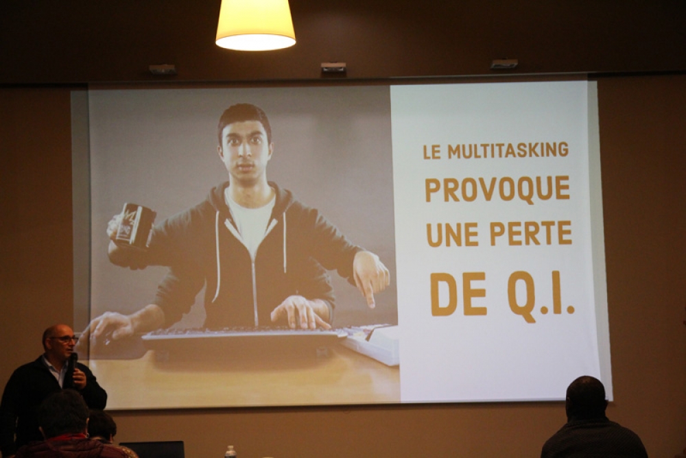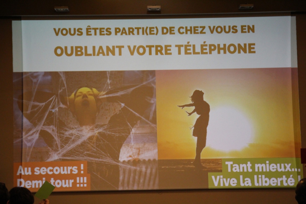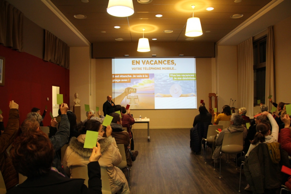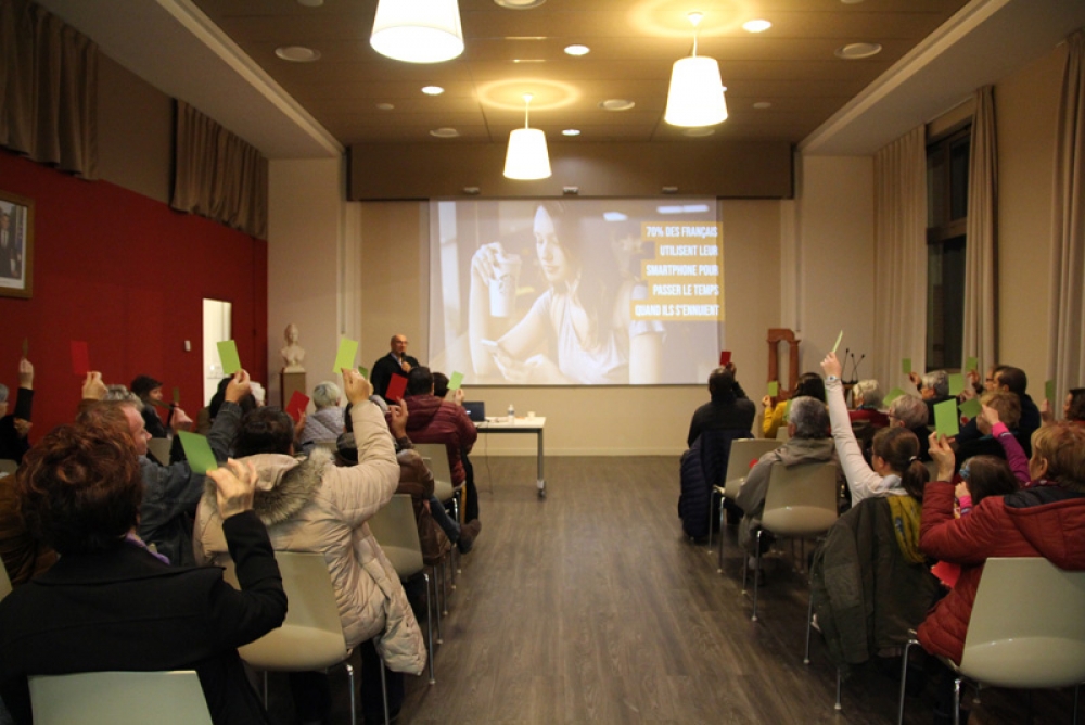 La conférence a fait salle comble au plaisir du formateur. "Je suis un « chasseur de stress »", nous confie t-il, "spécialisé dans la déconnexion numérique". Des papiers de couleurs étaient mis à disposition de l'assistance afin de répondre par oui (vert) ou par non (rouge) à chaque question posée afin de rendre la conférence à la fois vivante et ludique.