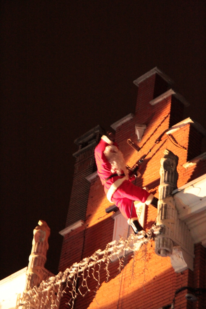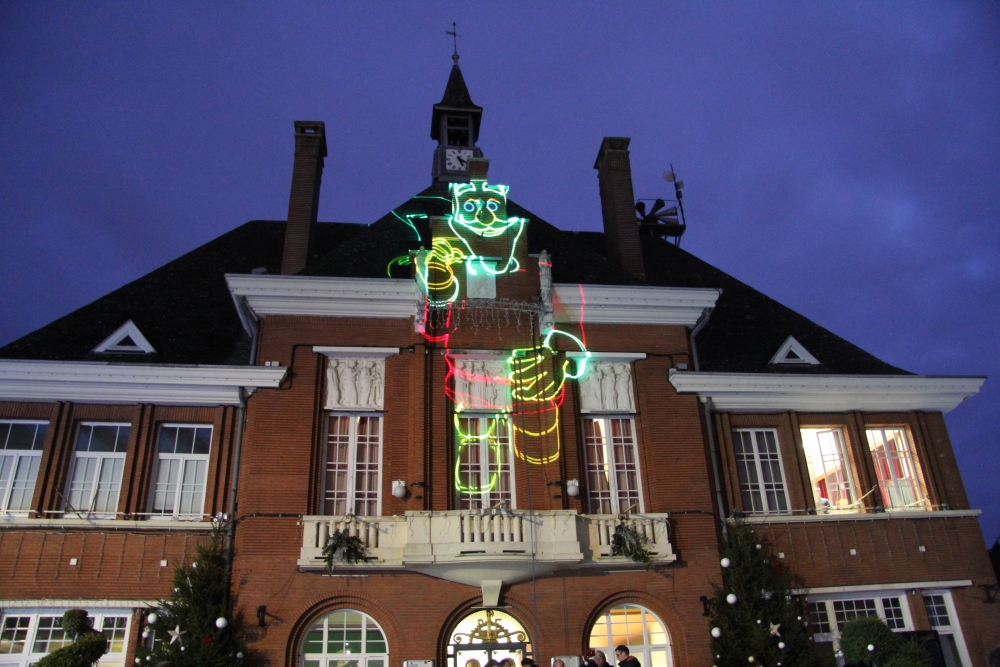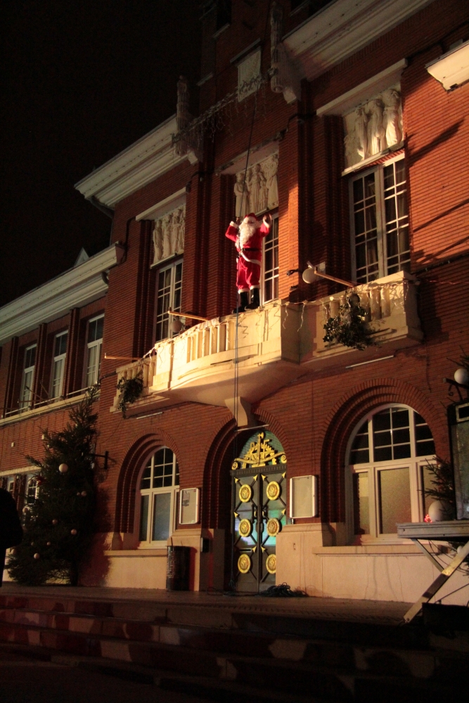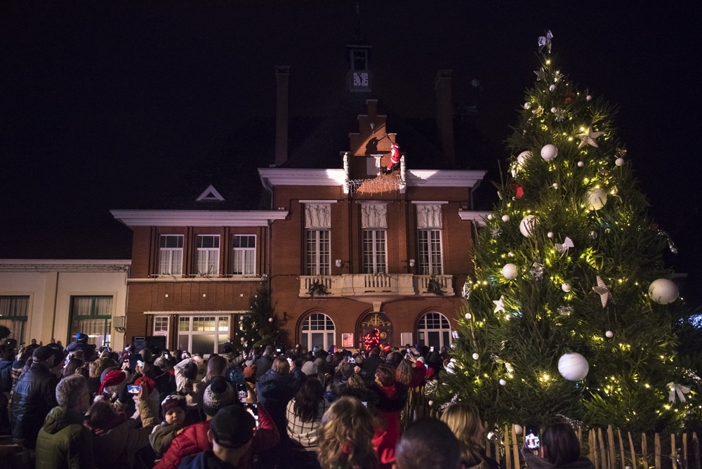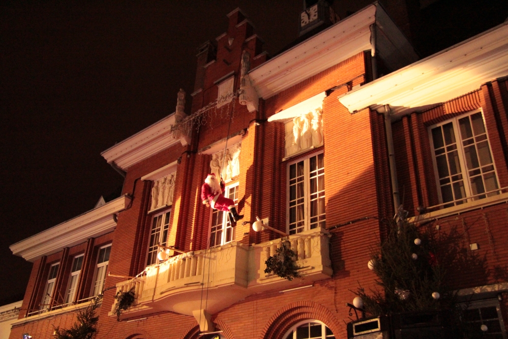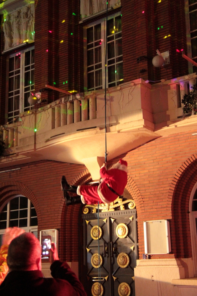Samedi, l’association « Country Danse » nous a fait une démonstration habillée de rouge et de chapeaux de Noël et, une fois la nuit tombée, tous les regards se sont levés vers le ciel pour s’émerveiller devant un conte de Noël pyromélodique avec « L’étonnante aventure de Fizzy le Bonhomme de neige », show laser projeté sur la façade le la Mairie, et devant un magnifique feu d’artifice ! Le Père Noël nous est ensuite apparu sur le toit de la Mairie pour descendre en rappel jusqu’au sol, des bonbons plein les poches pour distribuer aux enfants.