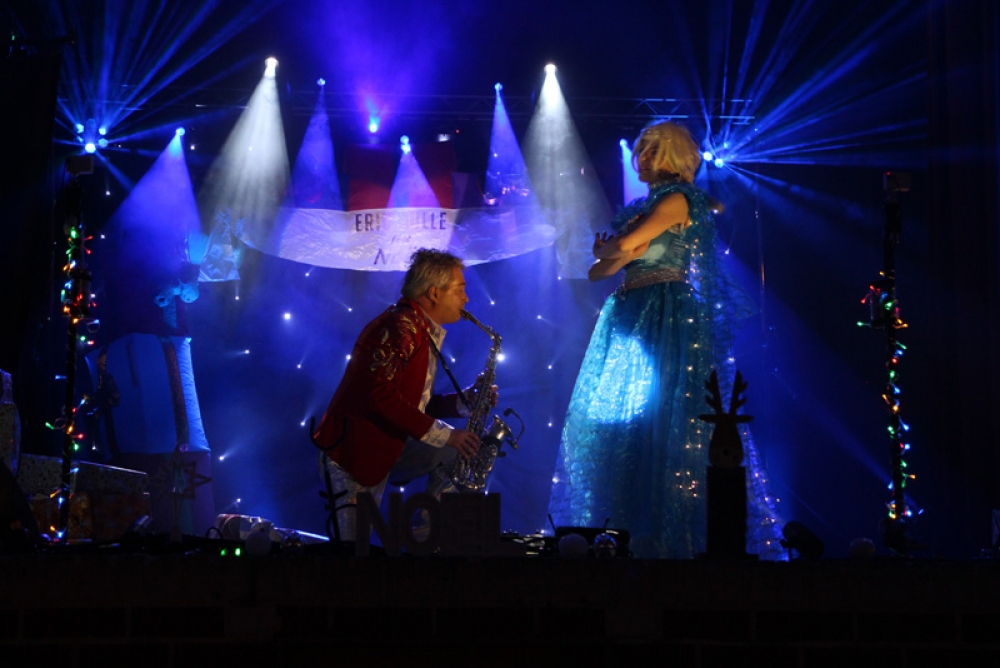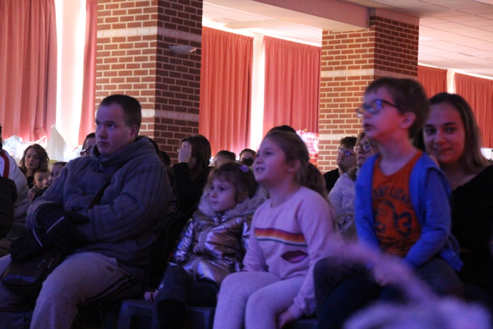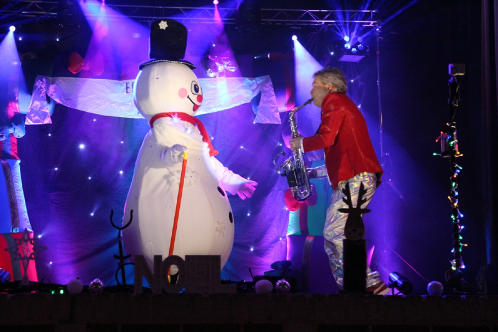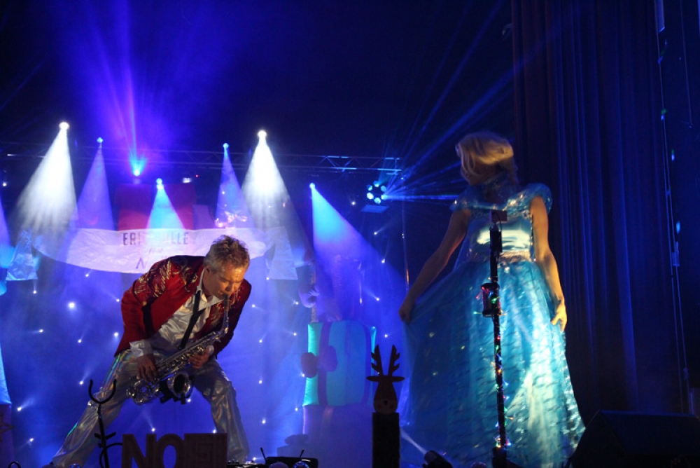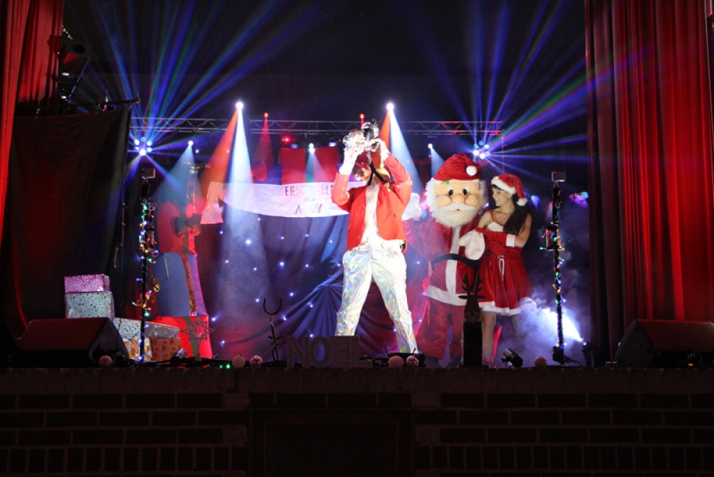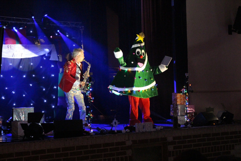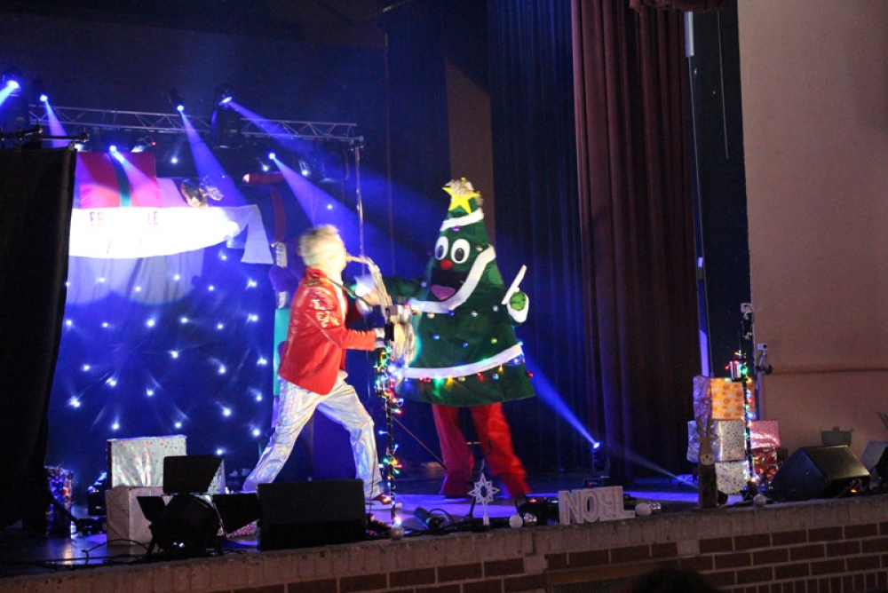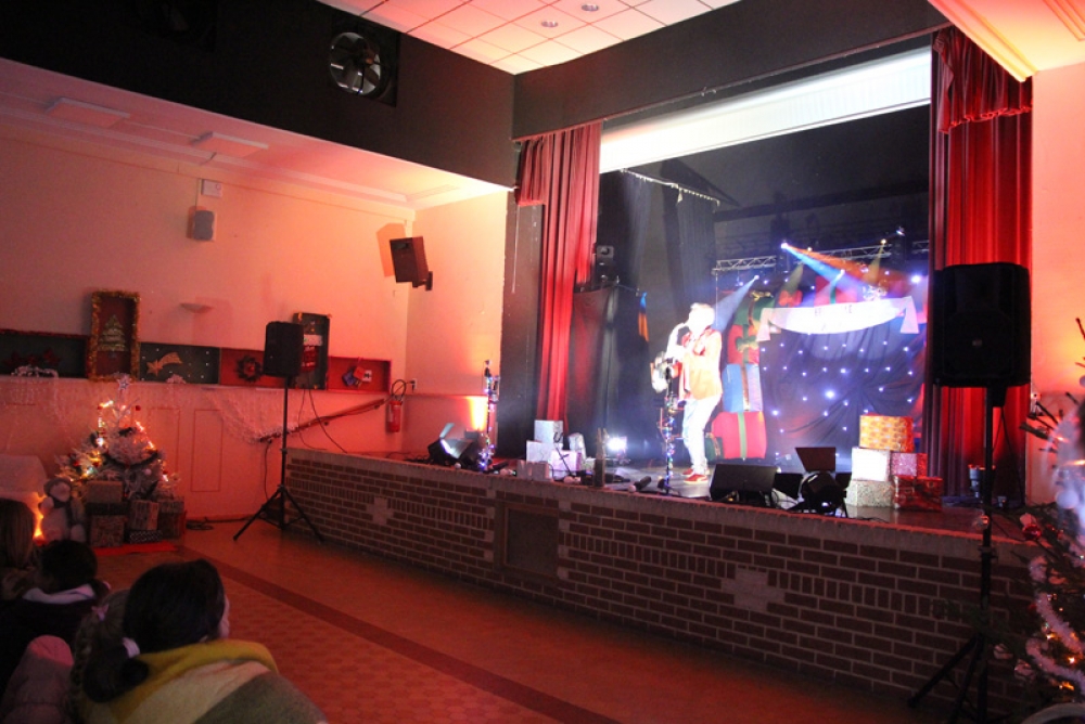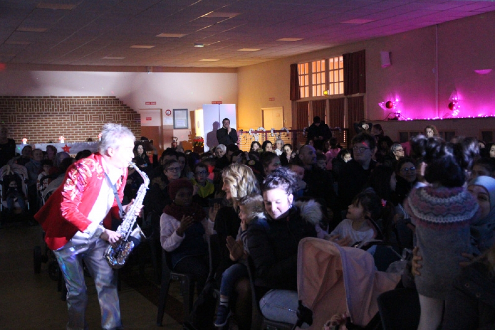 Une Salle des Fêtes emplie d’enfants accompagnés de leurs parents venus voir le spectacle de Noël d’Eric Dulle. Grâce à sa performance, ses mises en scène rythmées sur des chansons de Noël et son saxophone, il a dynamisé la salle et fait participer les enfants. Ses mascottes et lutins, venus l’accompagner, ont enchanté le public ainsi que la belle Elsa, notre Reine des Neiges.
