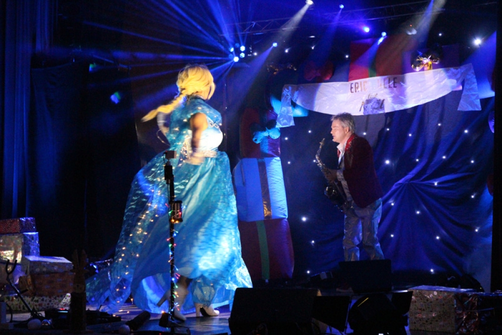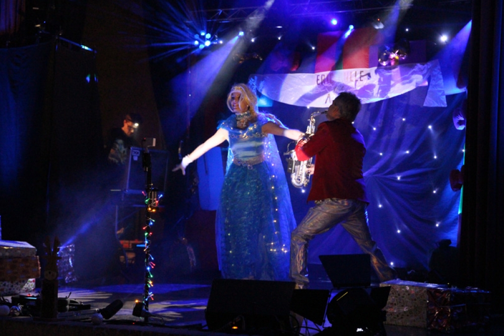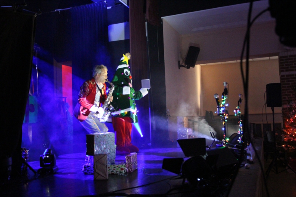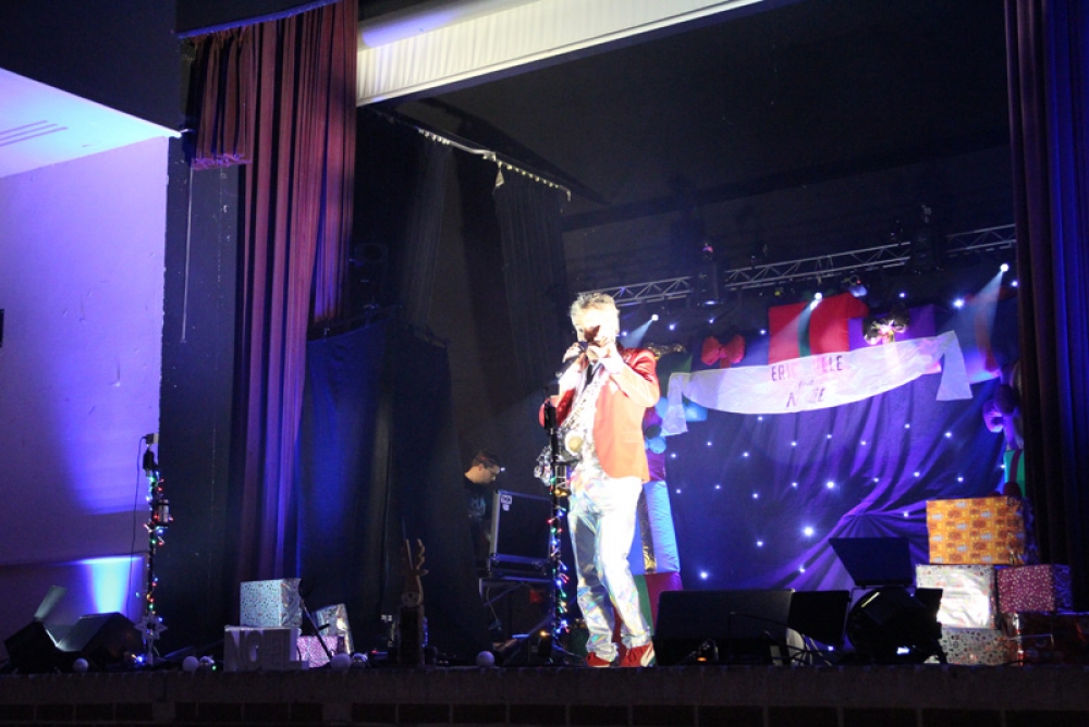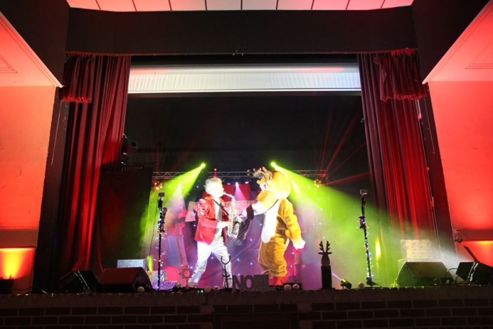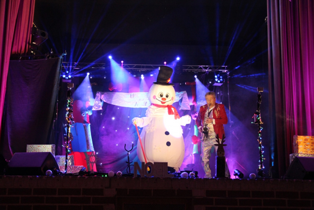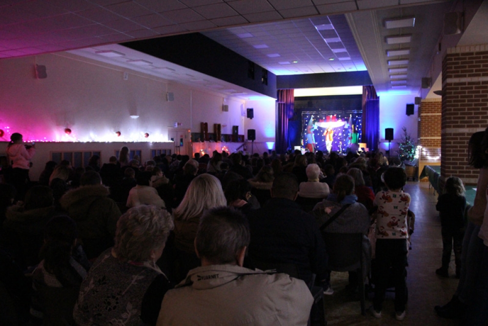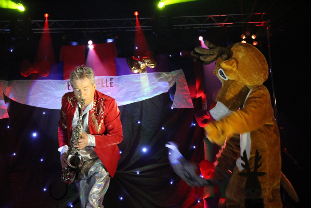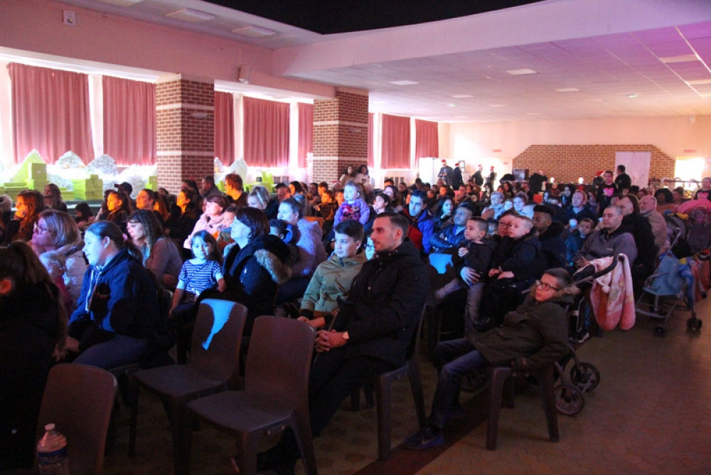 Une Salle des Fêtes emplie d’enfants accompagnés de leurs parents venus voir le spectacle de Noël d’Eric Dulle. Grâce à sa performance, ses mises en scène rythmées sur des chansons de Noël et son saxophone, il a dynamisé la salle et fait participer les enfants. Ses mascottes et lutins, venus l’accompagner, ont enchanté le public ainsi que la belle Elsa, notre Reine des Neiges.