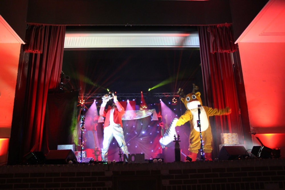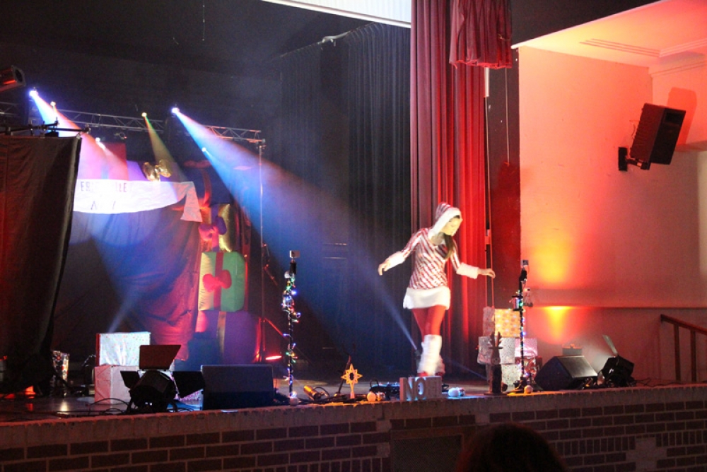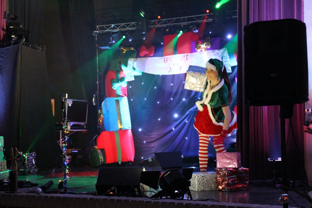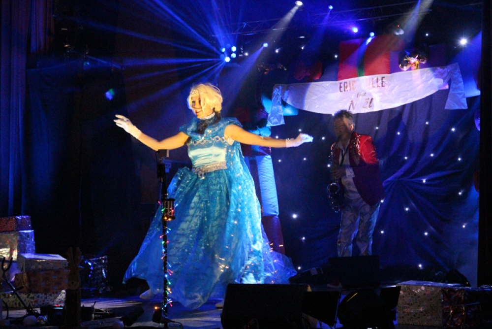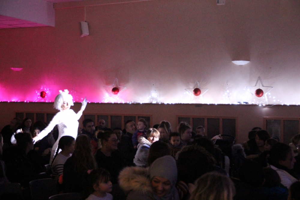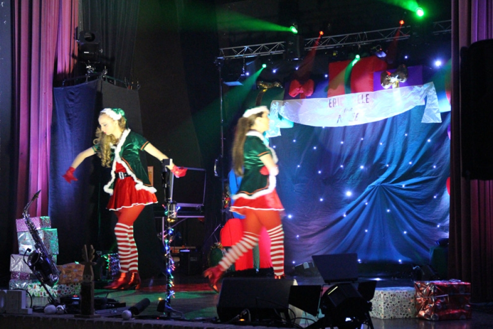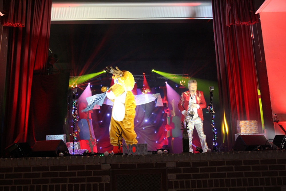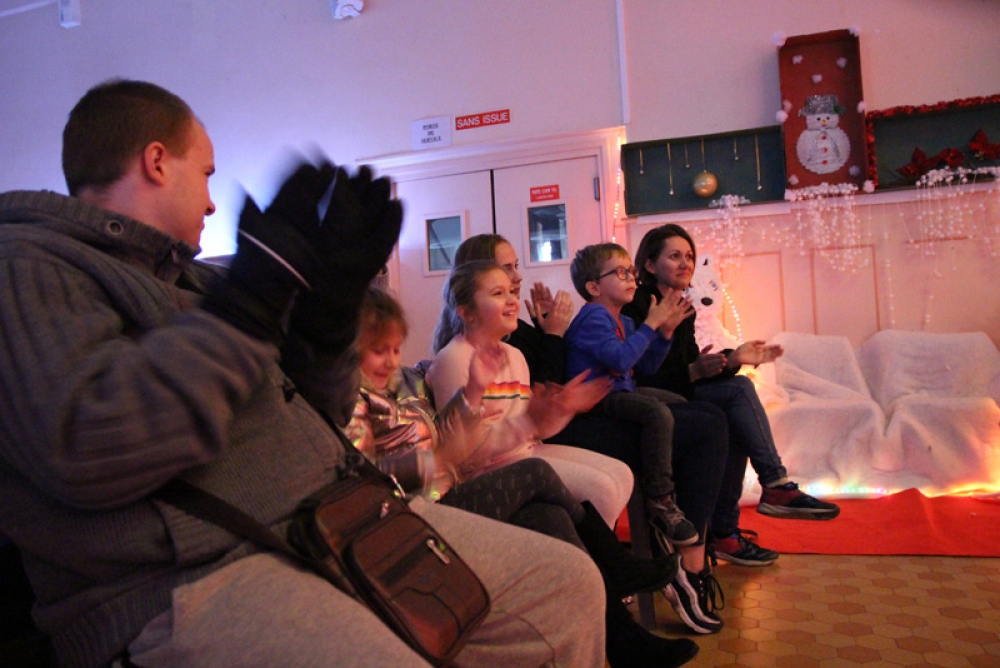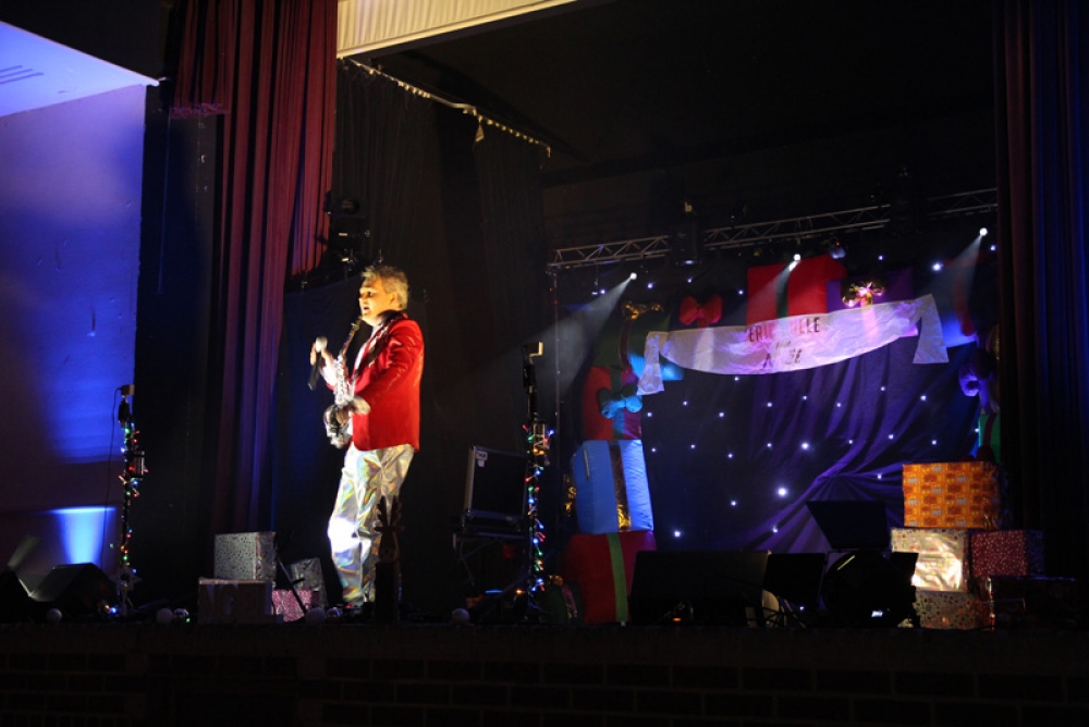 Une Salle des Fêtes emplie d’enfants accompagnés de leurs parents venus voir le spectacle de Noël d’Eric Dulle. Grâce à sa performance, ses mises en scène rythmées sur des chansons de Noël et son saxophone, il a dynamisé la salle et fait participer les enfants. Ses mascottes et lutins, venus l’accompagner, ont enchanté le public ainsi que la belle Elsa, notre Reine des Neiges.
