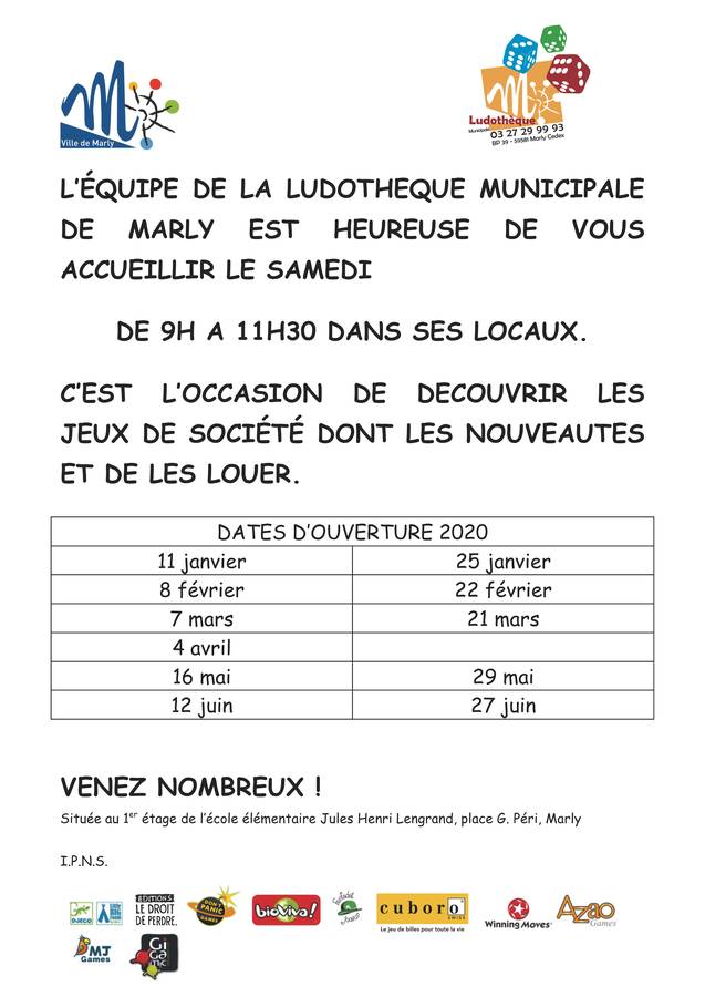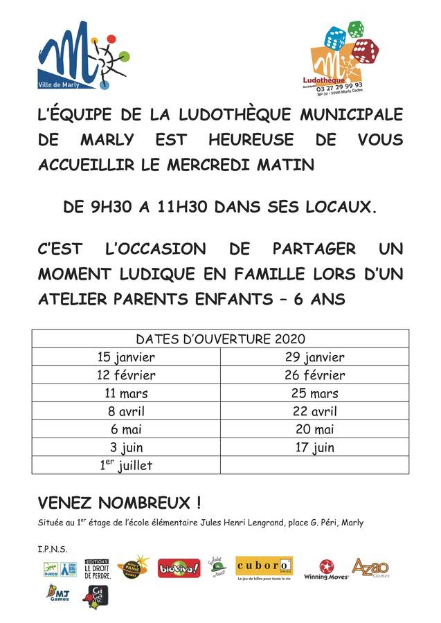 Ce mercredi 15 janvier, dans le cadre des ateliers parents/enfants en priorité pour les enfants de - 6 ans, l'équipe de la Ludothèque municipale aura le plaisir de vous accueillir de 9h30 à 11h30 dans ses locaux situés au 1er étage de l'École élémentaire Jules-Henri Lengrand place Gabriel Péri à Marly.
