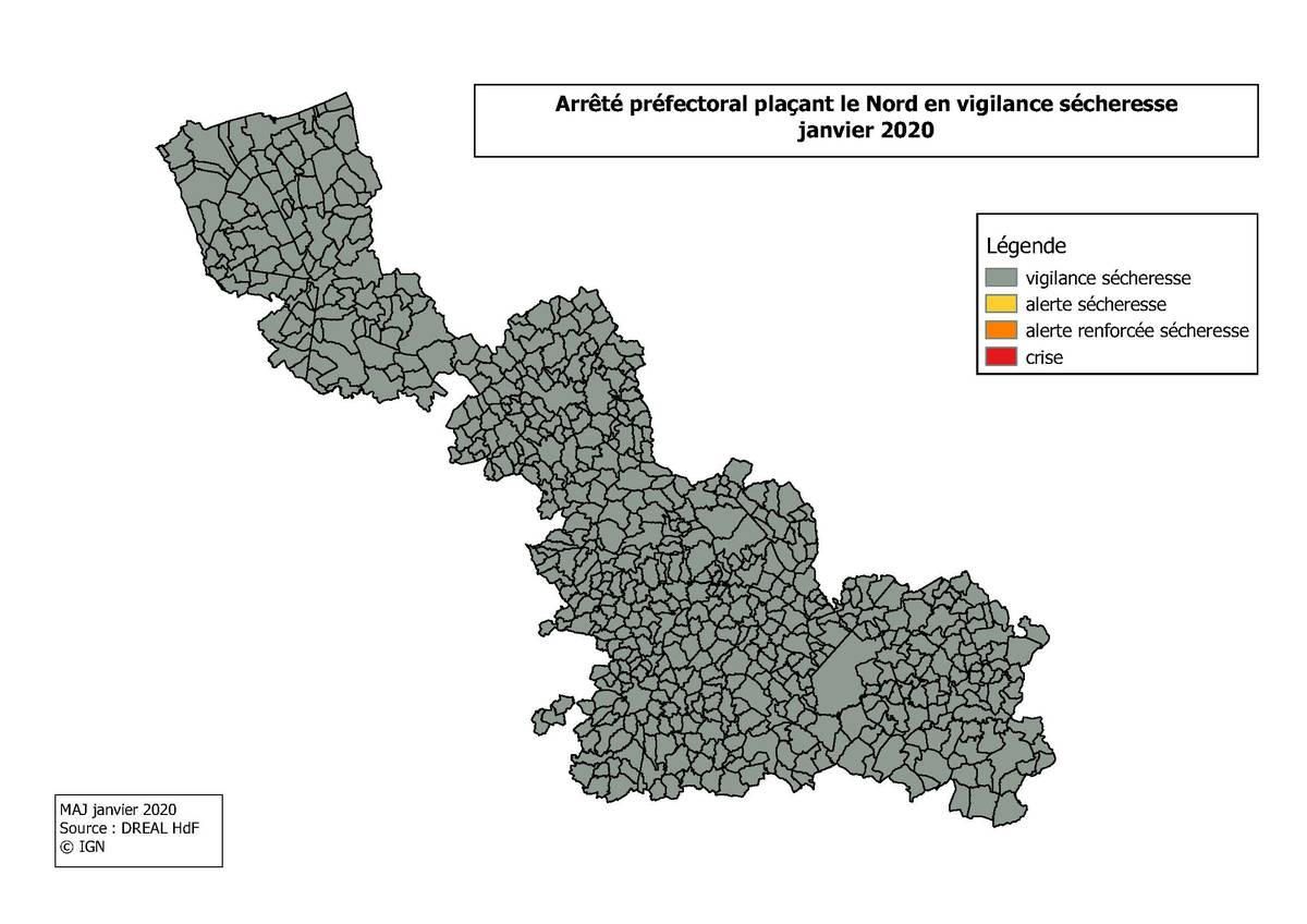 Veuillez trouver ci-après l'arrêté préfectoral plaçant le département du Nord en vigilance sécheresse jusqu'au 15 avril 2020.