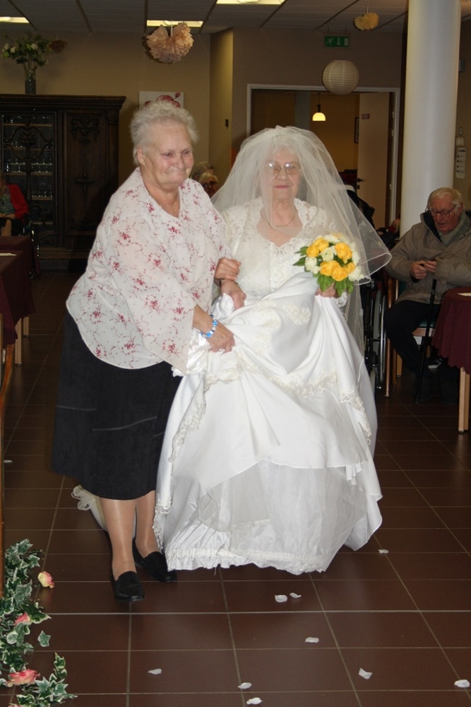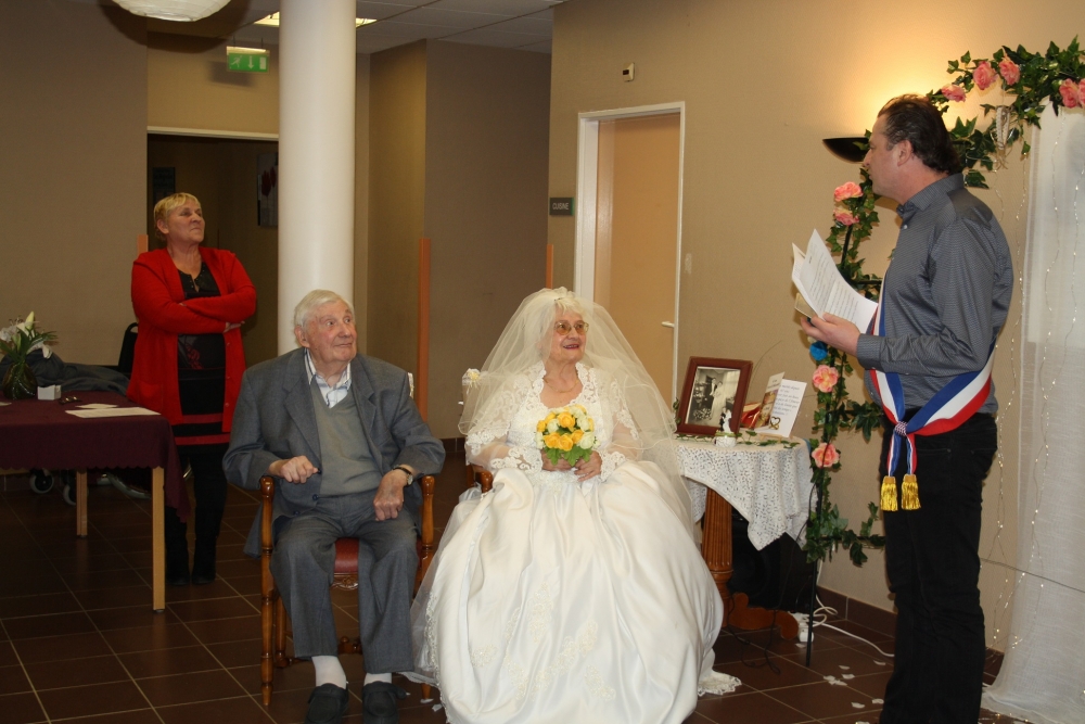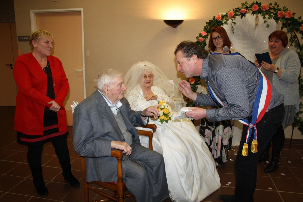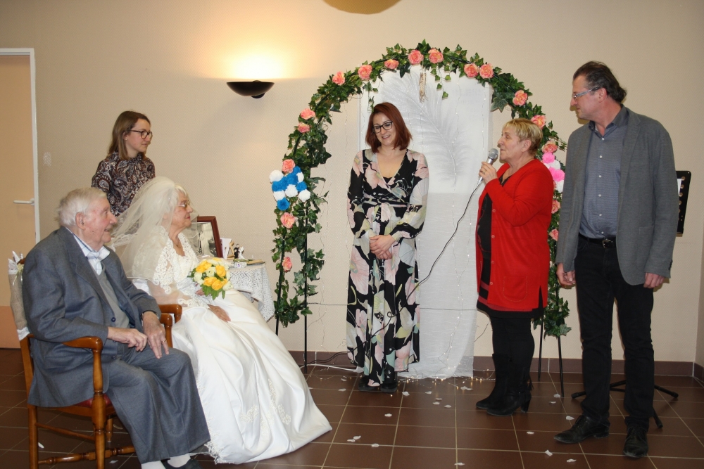 Et pour l’événement, Monsieur le Maire, Jérôme LEMAN accompagné de Marie-Thérèse HOUREZ, Première adjointe, ont effectué le déplacement à l’Ehpad pour remarier le couple entouré de leur famille. Ce fut l'occasion pour la psychologue, Virginie BARDIN, et l'animatrice, Alice POIRETTE, de retracer leur rencontre et féliciter les jeunes mariés !