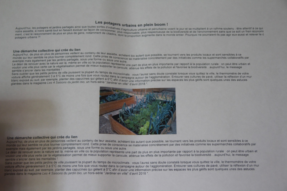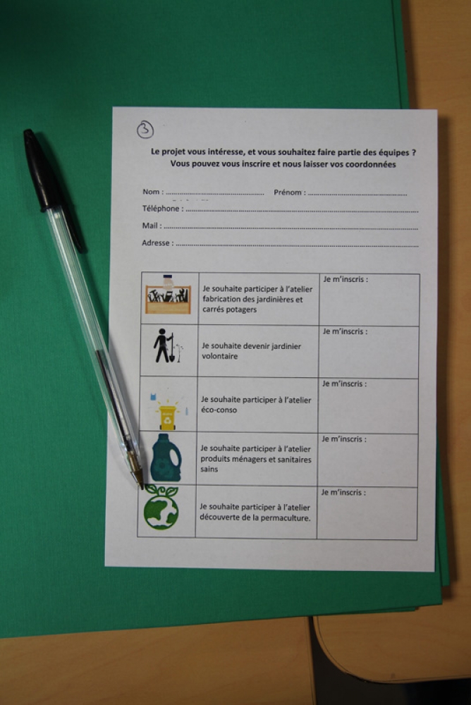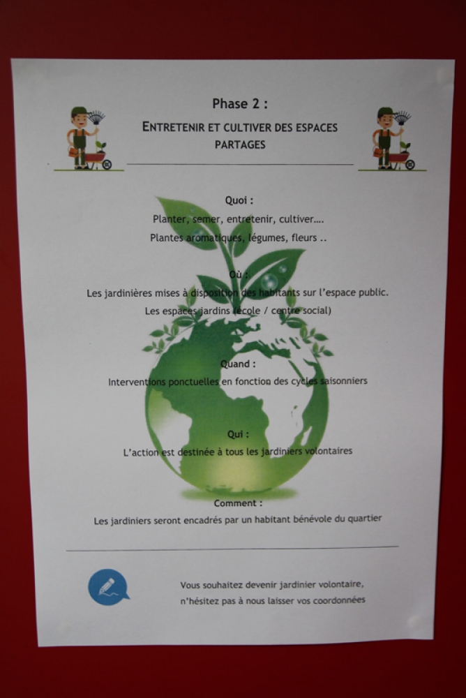 À partir du mois de mars, des ateliers de fabrication pour 10 carrés potagers et 15 jardinières seront organisés les mercredis pour tout habitant voulant s’investir dans le projet, adultes et enfants accompagnés, dans le but de semer, planter, entretenir, cultiver… plantes aromatiques, légumes fleurs…
