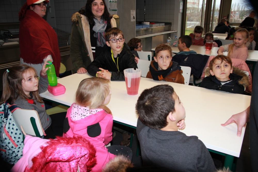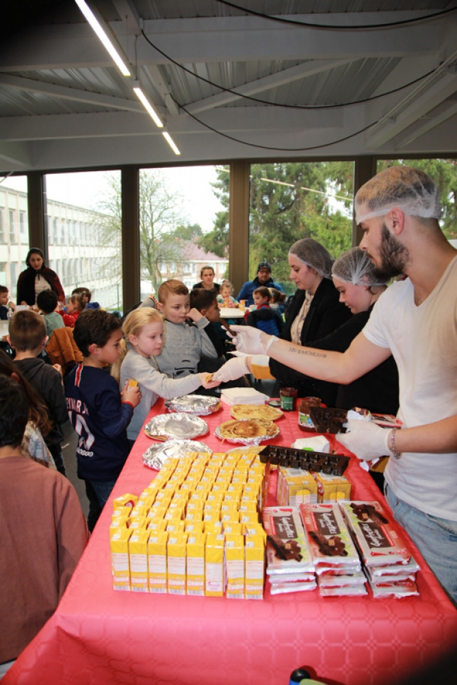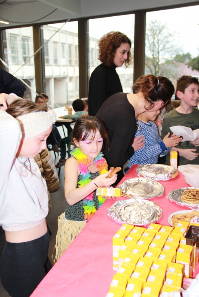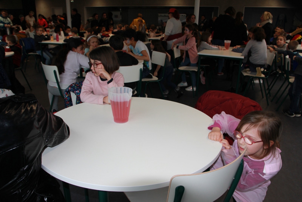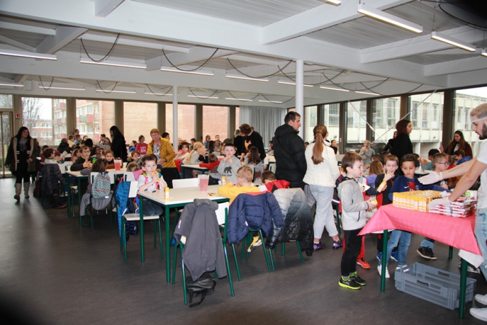 Une cantine pleine de vie et de joie, remplie d’enfants qui se sont régalés avec leurs crêpes, barres chocolatées et jus de fruits et où les éclats de rire se faisaient entendre !
