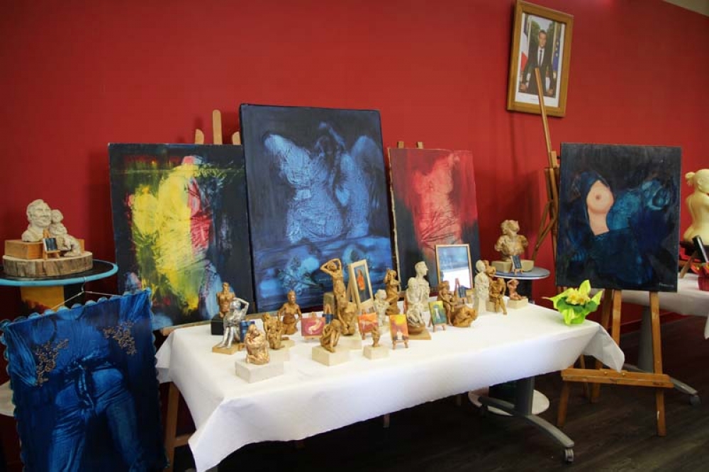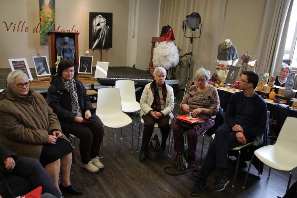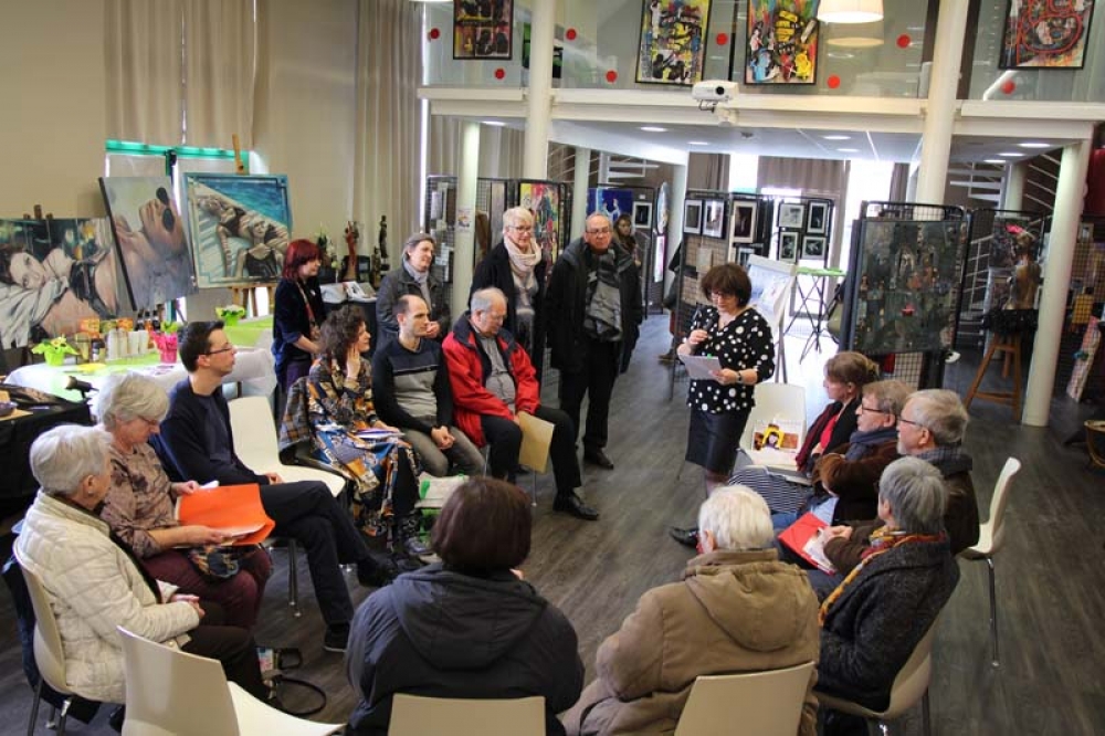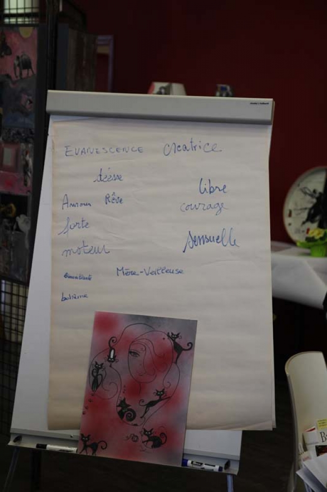 Rassemblé dans la salle du Conseil parmi les oeuvres diverses et variées de l'exposition, le petit groupe, qui s'est étoffé au fur et à mesure que l'heure avançait, a proposé un atelier simple : un mot, inscrit comme guide sur le tableau, devait aider nos poétes du jour à composer.