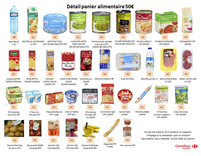 - Un colis alimentaire (produits frais, épicerie…) d’une quarantaine d’articles pour 50 € ;