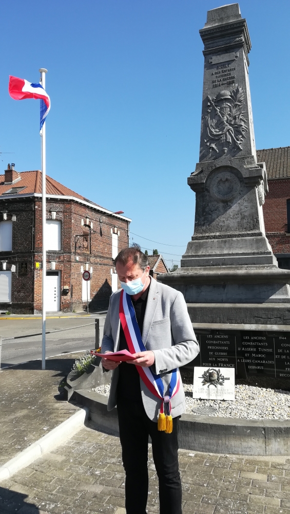 Il a eu par ailleurs une pensée renouvelée pour toutes les personnes en première ligne dans le combat actuellement mené contre le Covid-19. Et a conclu cette cérémonie en remerciant M. Didier Vilcot, agent des Services Techniques présent pour l’occasion, et tous les agents de la Ville de Marly qui, en ces moments difficiles et douloureux, continuent de vous servir au quotidien.