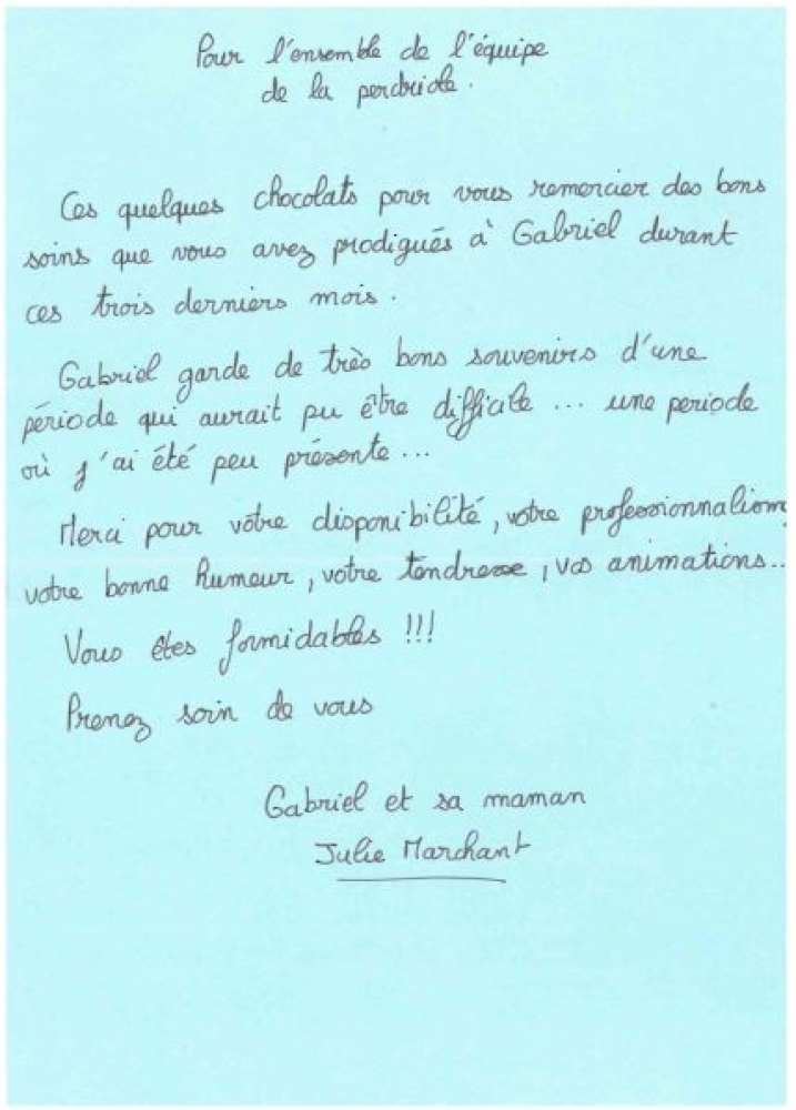 Parmi lesquels, ce message de la maman du petit Gabriel, accueilli au Jardin d’enfant, à la Perdriole, au titre de la mise en œuvre de l’accompagnement des enfants des personnels indispensables à la gestion de la crise du Covid-19. (cf. photo)