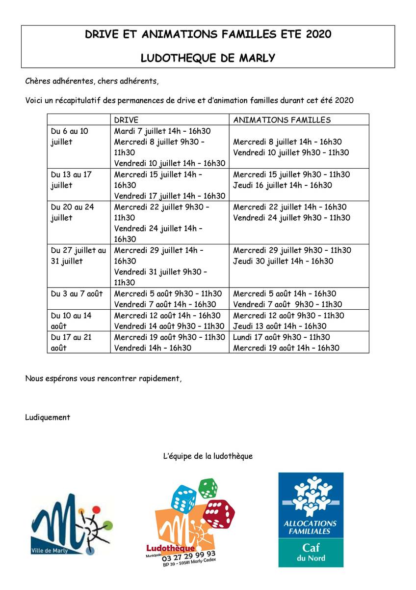 La Ludothèque, située au 1er étage de l’Ecole Primaire Jules-Henri Lengrand, place Gabriel Péri, ouvre à nouveau ses portes dès le 6 juillet 2020 en fonction du calendrier ci-après.