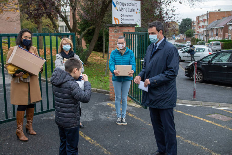 Le 2 novembre dernier, après les vacances de la Toussaint, la Municipalité s’est rendue aux abords des différentes écoles de la Ville afin de s’assurer du bon déroulement de la rentrée scolaire. Monsieur le Maire, Jean-Noël VERFAILLIE, accompagné de l’adjointe chargée de la politique éducative, Assia COSTANZO en ont profité pour offrir aux enfants, avant l’entrée en classe, des masques.