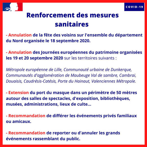 Face à l'accélération brutale de l'épidémie, le préfet a décidé de renforcer les mesures sanitaires dans le département du Nord :