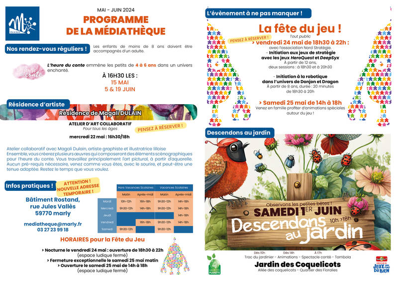 Au programme : l’heure du conte, un atelier d’art collaboratif, la fête du jeu (les 24 et 25 mai), et la journée au jardin le 1er juin !