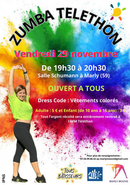 Le vendredi 29 novembre, de 19h30 à 20h30, une séance spéciale de ZUMBA au profit du Téléthon est organisée à la salle Schumann, à Marly. Ouvert à tous :