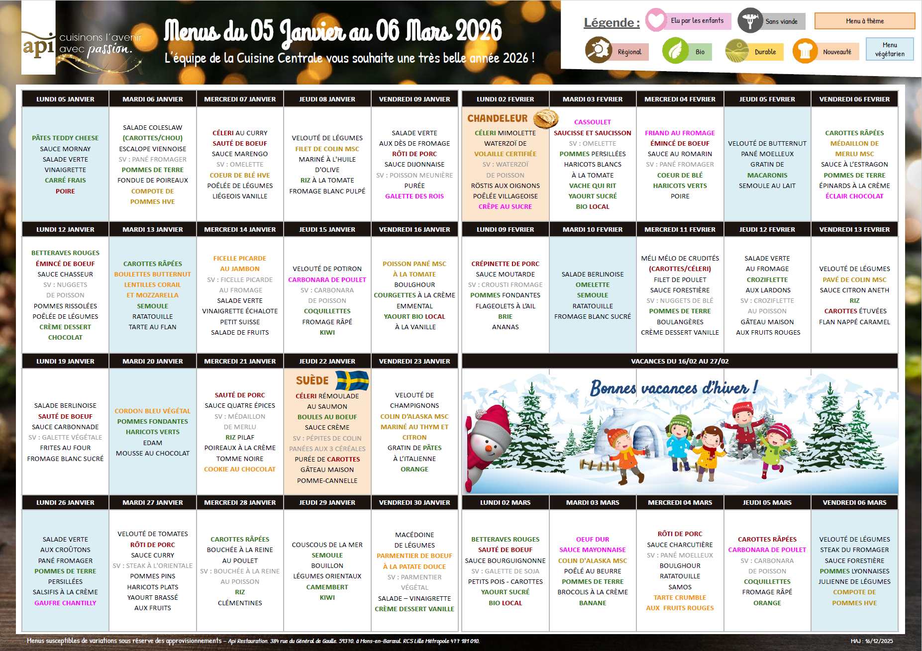 Menu cantine du 5 janvier au 6 mars 2026 (cliquez pour zoomer)