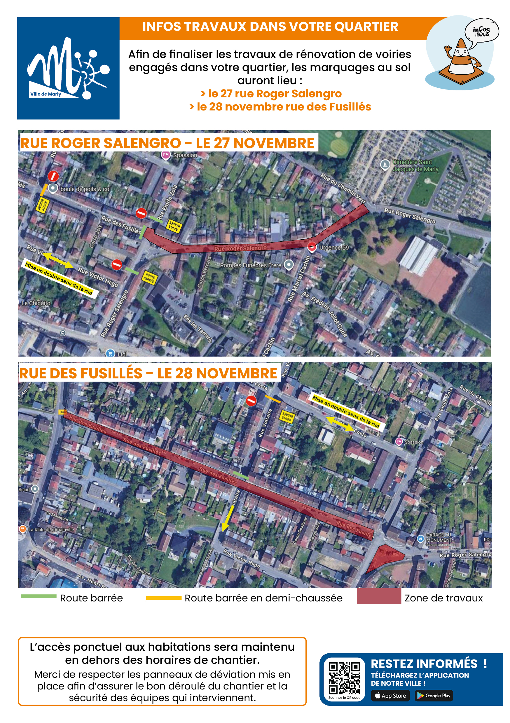 Les marquages au sol au sol dans le cadre de la rénovation de voiries rue Roger Salengro et rue des Fusillés auront lieu les 27 et 28 novembre 2025.