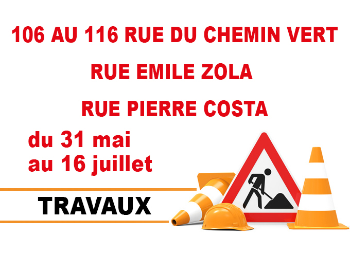 Des travaux de comblement de carrières auront lieu du n° 106 au 116 rue du Chemin Vert, rues emile Zola et Pierre Costa du 31 mai au 16 juillet 2021.
