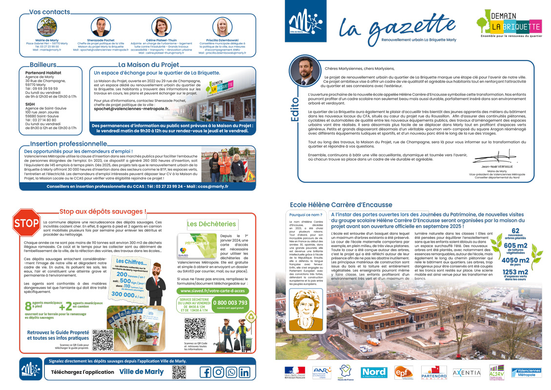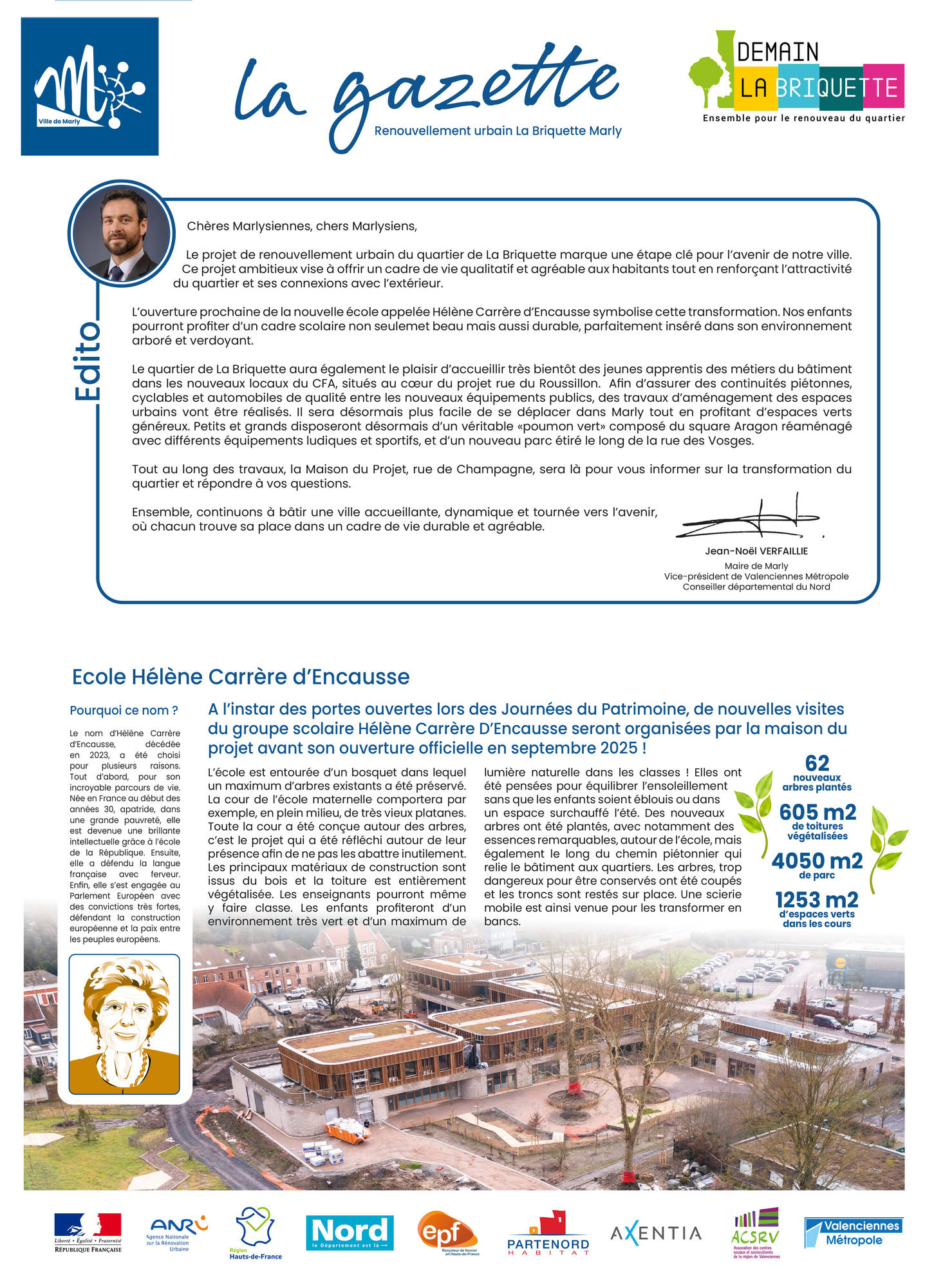 L’ouverture prochaine de la nouvelle école appelée Hélène Carrère d’Encausse symbolise cette transformation. Les enfants pourront profiter d’un cadre scolaire non seulemet beau mais aussi durable, parfaitement inséré dans son environnement arboré et verdoyant. Le quartier de La Briquette aura également le plaisir d’accueillir très bientôt des jeunes apprentis des métiers du bâtiment dans les nouveaux locaux du CFA, situés au coeur du projet rue du Roussillon. Afin d’assurer des continuités piétonnes, cyclables et automobiles de qualité entre les nouveaux équipements publics, des travaux d’aménagement des espaces urbains vont être réalisés. Il sera désormais plus facile de se déplacer dans Marly tout en profitant d’espaces verts généreux. Petits et grands disposeront désormais d’un véritable « poumon vert » composé du square Aragon réaménagé avec différents équipements ludiques et sportifs, et d’un nouveau parc étiré le long de la rue des Vosges.